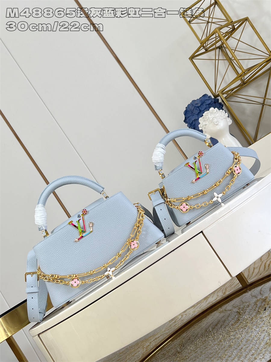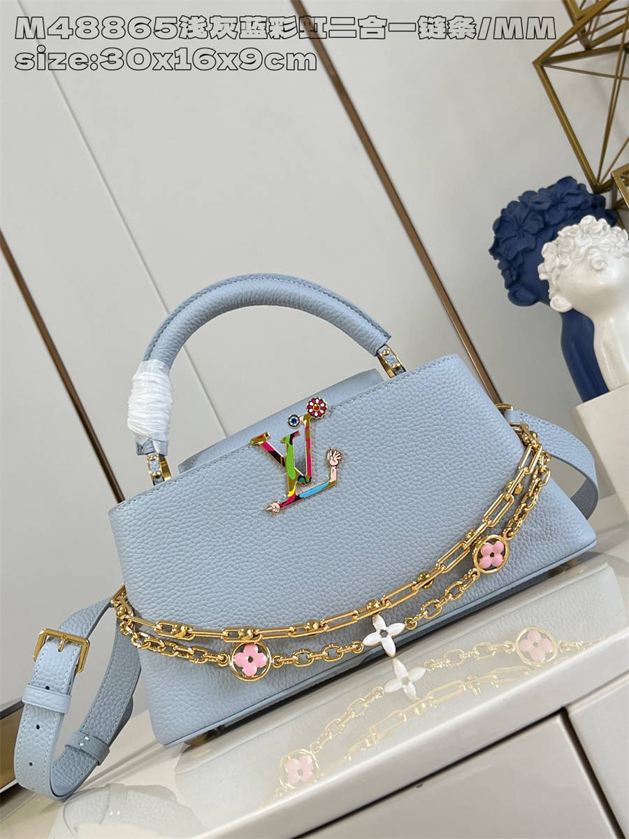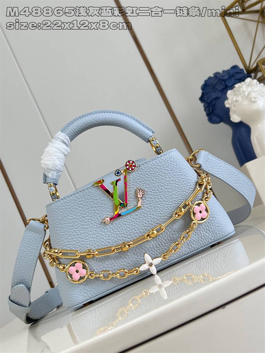 BDKK BEKK【独家实拍 M48865浅灰蓝彩虹二合一链条/迷你 】M13707 本款 Capucines East West 迷你手袋出自路易威登 x 村上隆再版系列 采用横向构型,为品牌经典设计带来新锐解读。华美牛皮革和金属件流露哑光质感,充裕空间可轻松收纳手机、长款钱夹和其他日常所需。可拆卸并调节的皮革肩带实现更多造型可能。