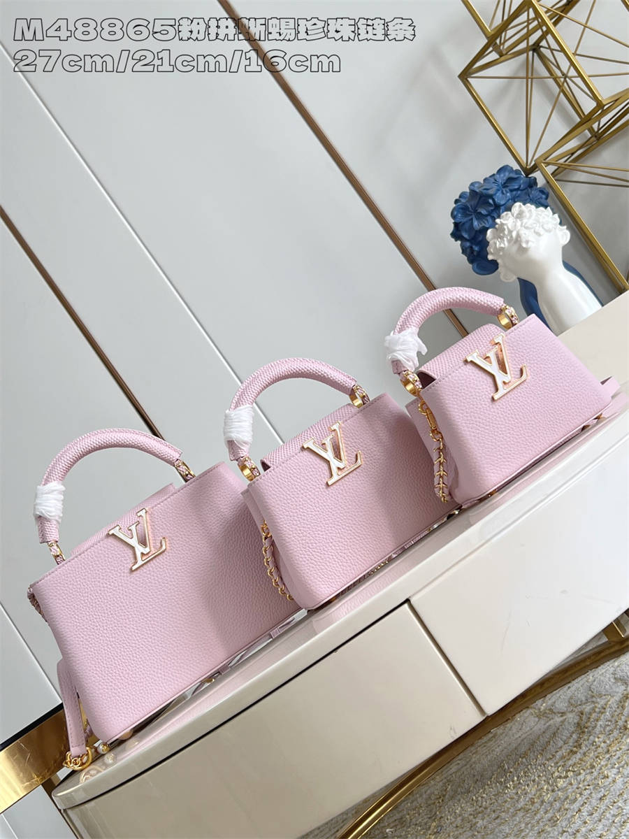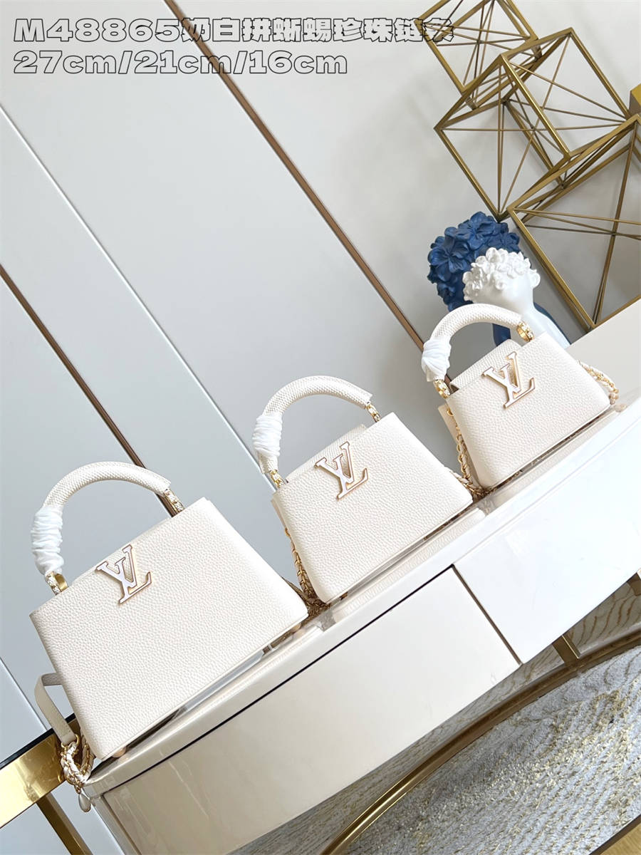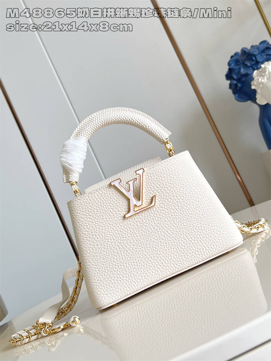 【独家实拍 M48865黑拼蜥蜴珍珠链条/超迷你 】本款 Capucines nano手袋采用 Taurillon 皮革塑造玲珑构型,以蜥蜴皮革包裹翻盖、手柄和 LV 字母。翻盖可外置或内收以读取 LV 标识,可拆卸宽幅皮革肩带洋溢摩登风尚。BCKK BCFK BDFK