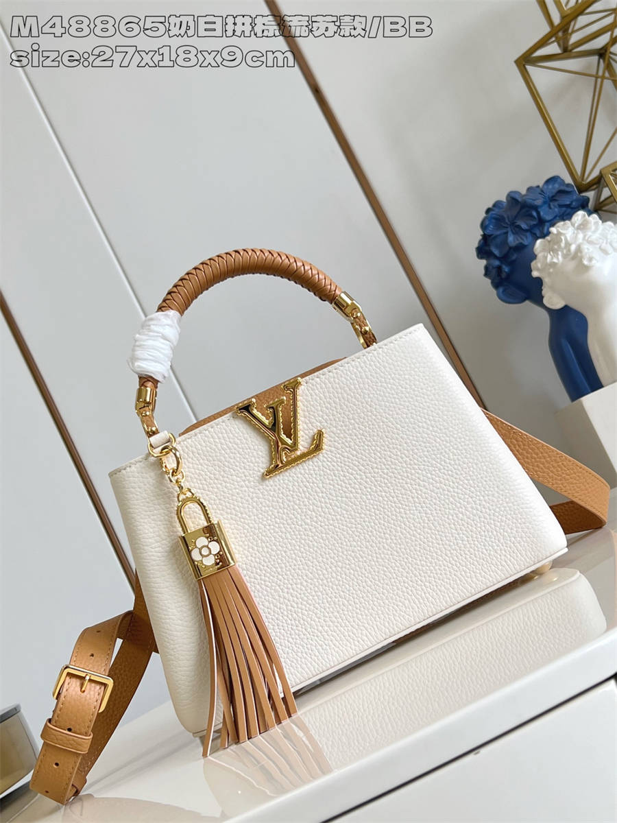 【独家实拍 M48865奶白拼棕流苏款/小号 】M2546 Crafty 系列再度赋予 Capucines BB 手袋匠心之光。Taurillon 牛皮革塑造经典构型,编织手柄再添考究格调。LV 字母映现拷花效果,挂锁下方悬挂可拆卸流苏。BEKK BFKK