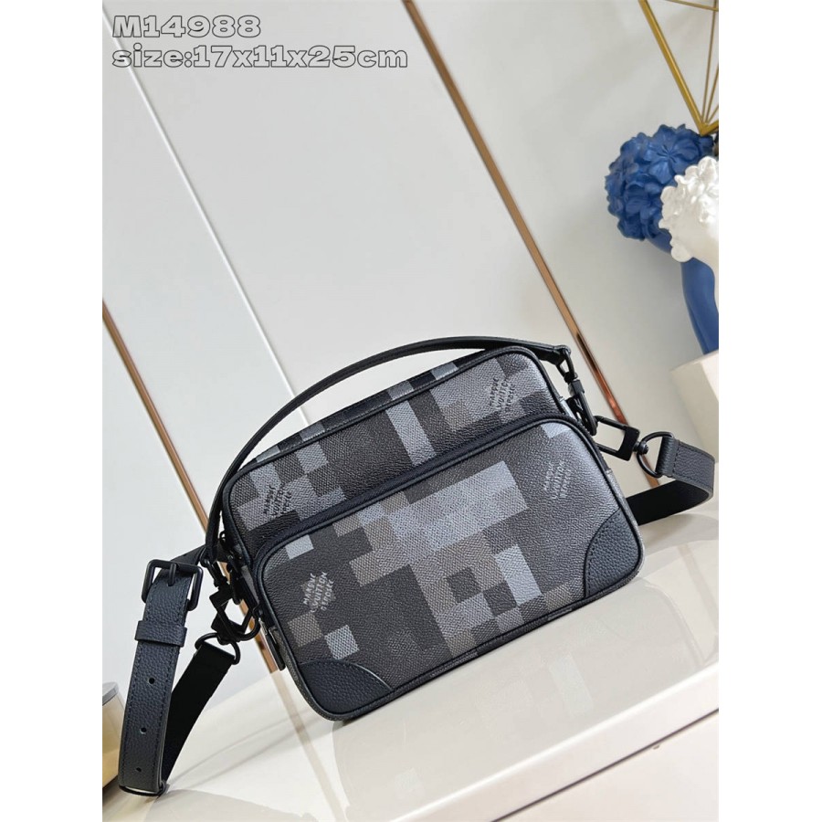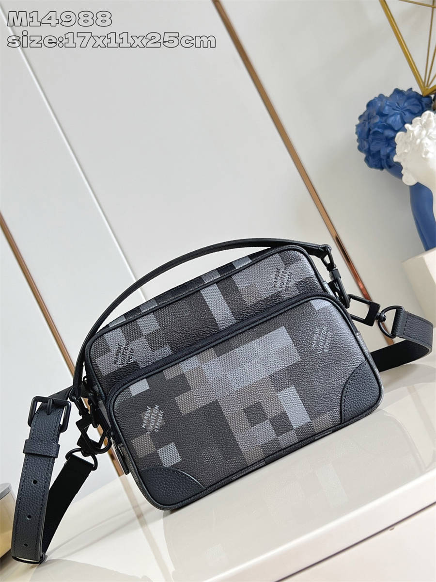 HKK【独家实拍 M14988 】本款 Nil 邮差包取材 Pharrell Williams 焕新演绎的 Damoflage Black 涂层帆布,将设计师的新锐视角与品牌传统创意融合,呈现迷彩般的像素效果 Damier 图案。拉链前袋与主隔层完善功能构型。17.5 x 11 x 25 厘米 (高 x 宽 x 长度)