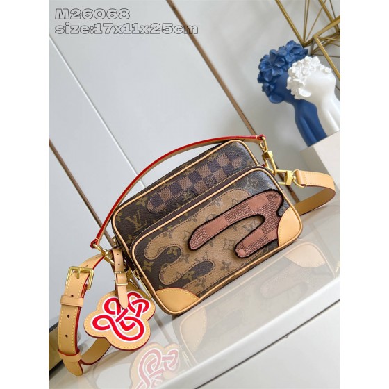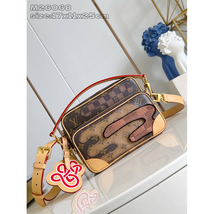 HKK【独家实拍 M26068 】本款 Nil 斜挎包为 Monogram 帆布包身融入 Damier 和 Monogram Reverse 帆布贴饰,营造雅致拼贴画效果。宽敞主隔层和拉链前袋确保便捷取放,可拆卸顶部手柄和肩带实现多种背携方式。17.5 x 11 x 25 厘米 (高 x 宽 x 长度)