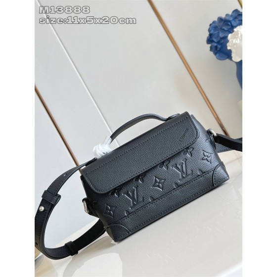 GIK【独家实拍 M13888黑 】本款 Steamer East West 迷你手袋以 Monogram 压纹 Taurillon 牛皮革演绎横向构型,彰显 Steamer 系列的经典设计。翻盖开合、别致加固包角和顶部手柄构筑考究细节。搭配可调节肩带,实现斜挎手提随心切换。11 x 5 x 20 厘米 (高 x 宽 x 长度)
