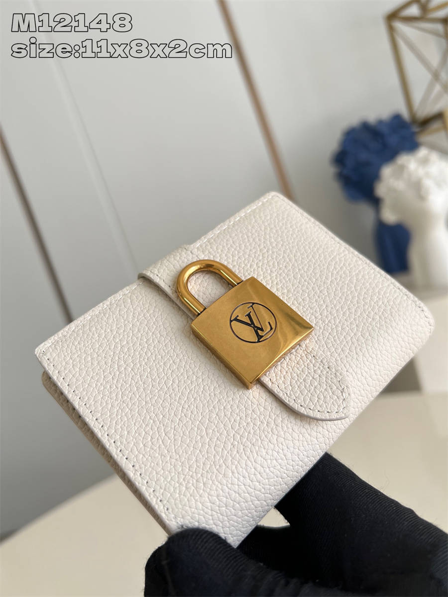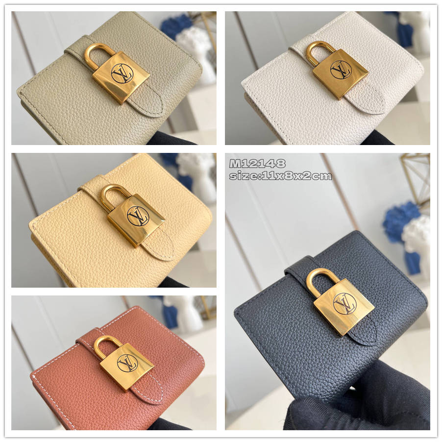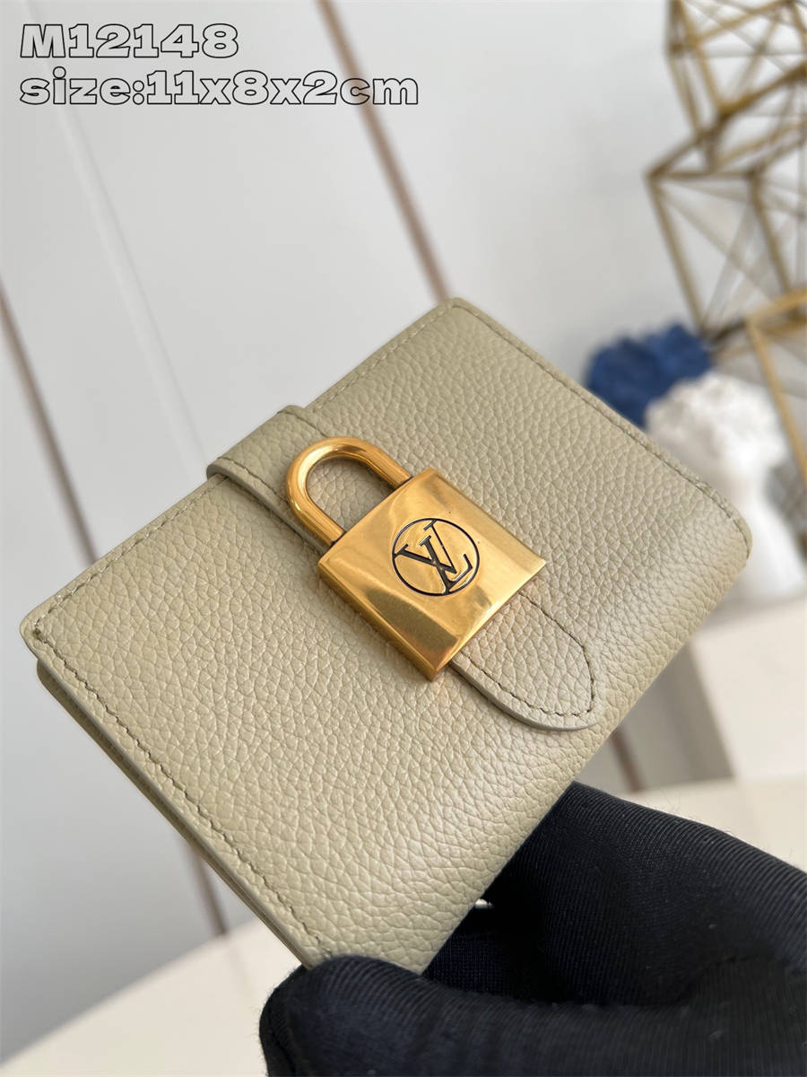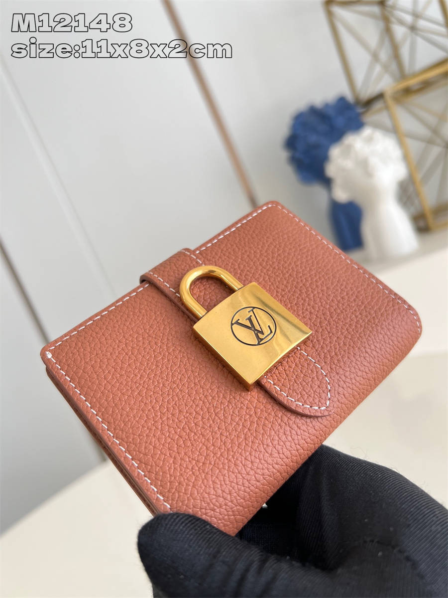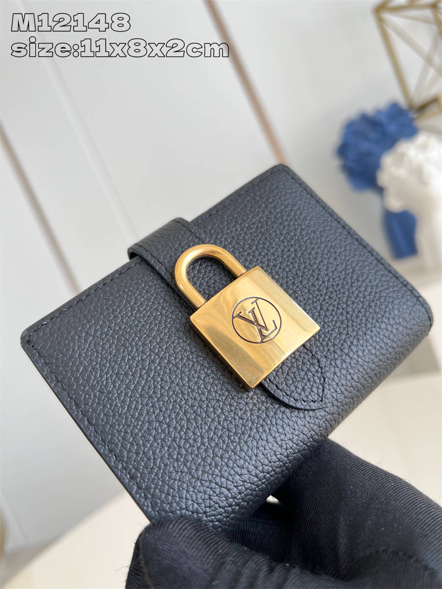 DFK【独家实拍 M12148黑 】 M12408 新款Low Key 钱夹体现了极简主义设计,同时彰显了品牌的传统工艺。它由光滑的小牛皮制成,配有奢华的牛皮衬里,并配有一个光滑的金色挂锁,具有仿古效果。在里面,它提供了多个硬币和纸币的口袋,以及三个卡槽。11 x 8.5 x 2