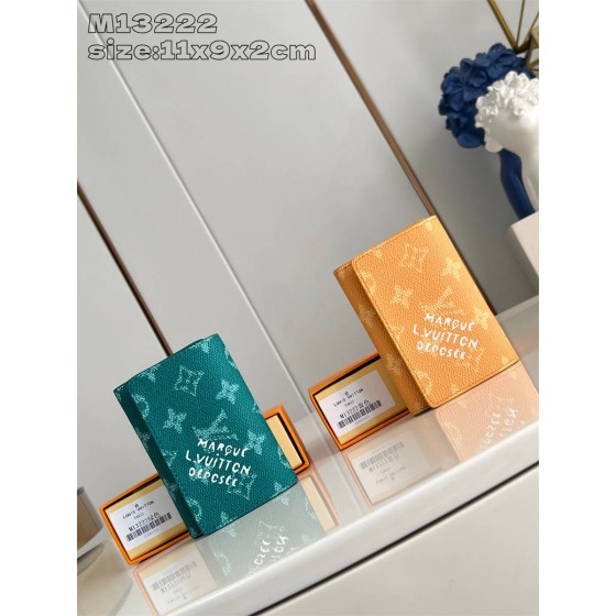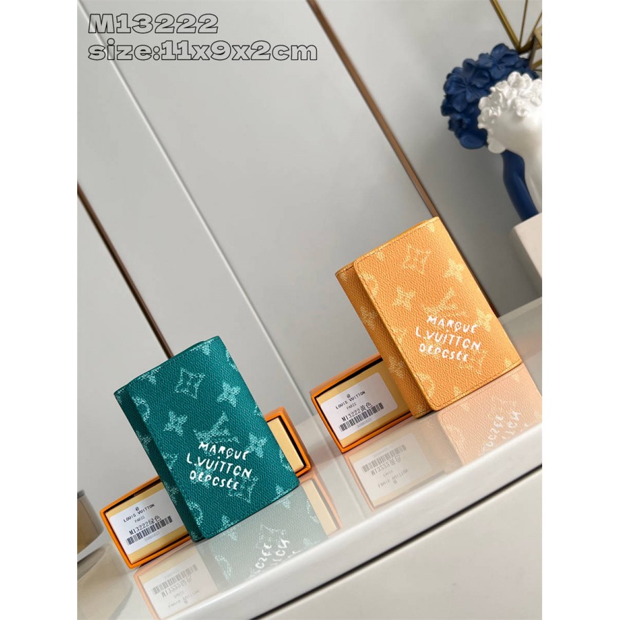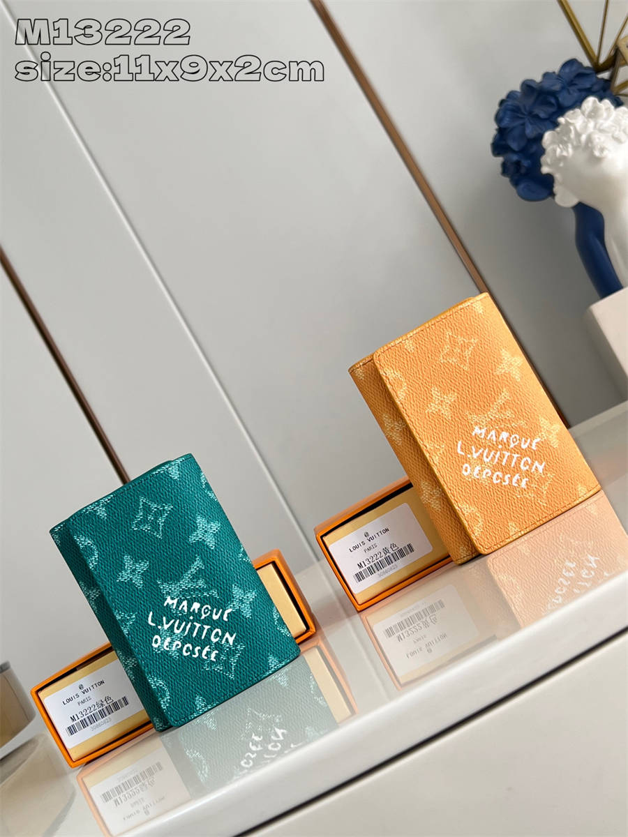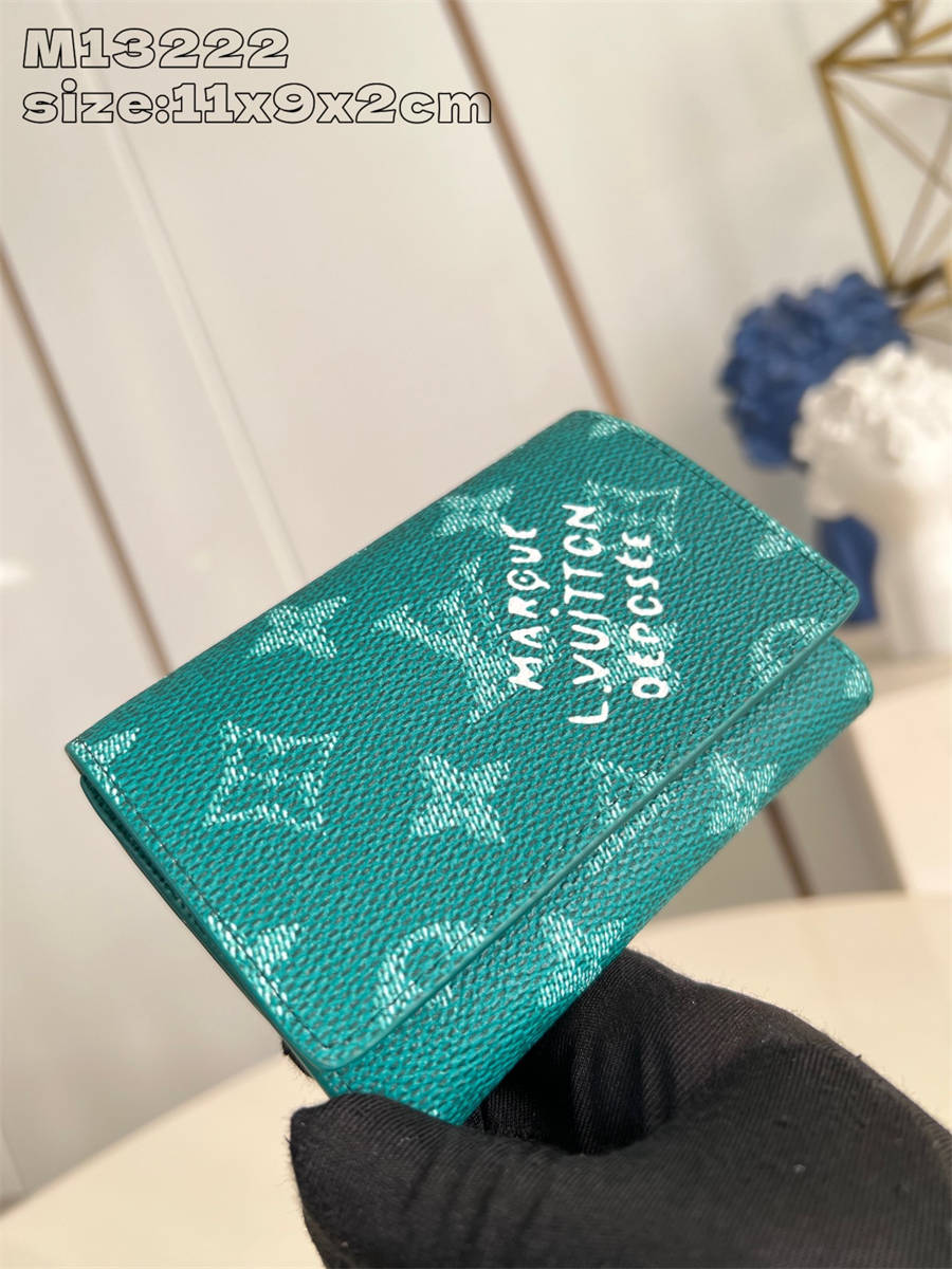 CIK【独家实拍 M13222绿 】Monogram Heritage帆布制作的“Victor Wallet”。紧凑、实用、运动型,非常适合携带现金和卡片。以鲜艳的色彩和复古风格的“Marque L.Vuitton Déposée”签名完成时尚。具有纸币口袋、带拉链的口袋和5个卡槽的功能性也很吸引人。按扣开合式。尺寸:11.5×9×2.5cm