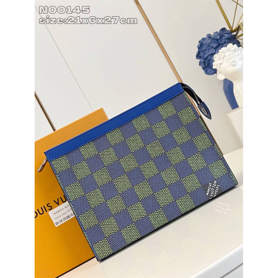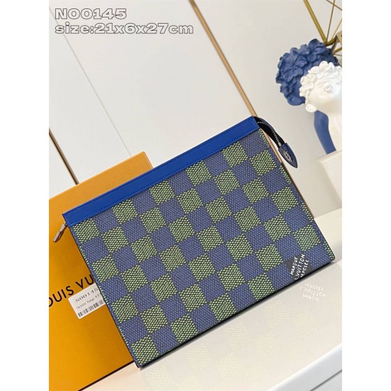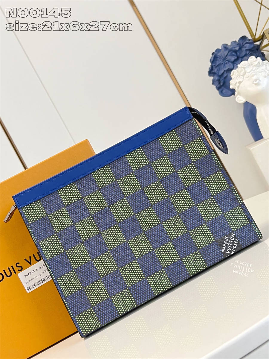 DCK【独家实拍 N00145 】此款小巧而时髦的 Pochette Voyage 中号手袋采用 Damier Graphite 格纹涂层帆布材质,功能多样,既可作为旅行袋放于包中,亦可持于手中,展现时尚风格。宽敞的包内空间加上撑板设计,方便取用私人用品。21 x 6 x 27 厘米 (高 x 宽 x 长度)