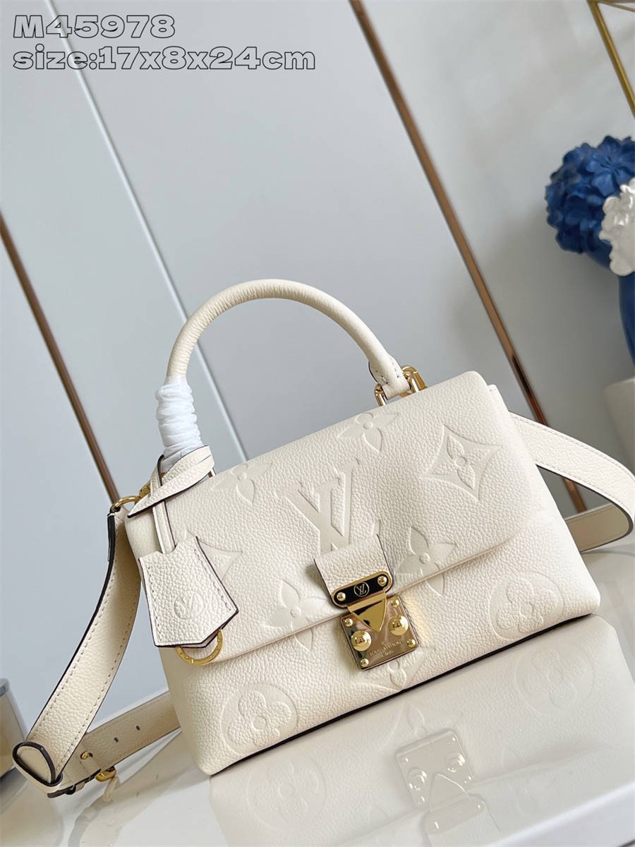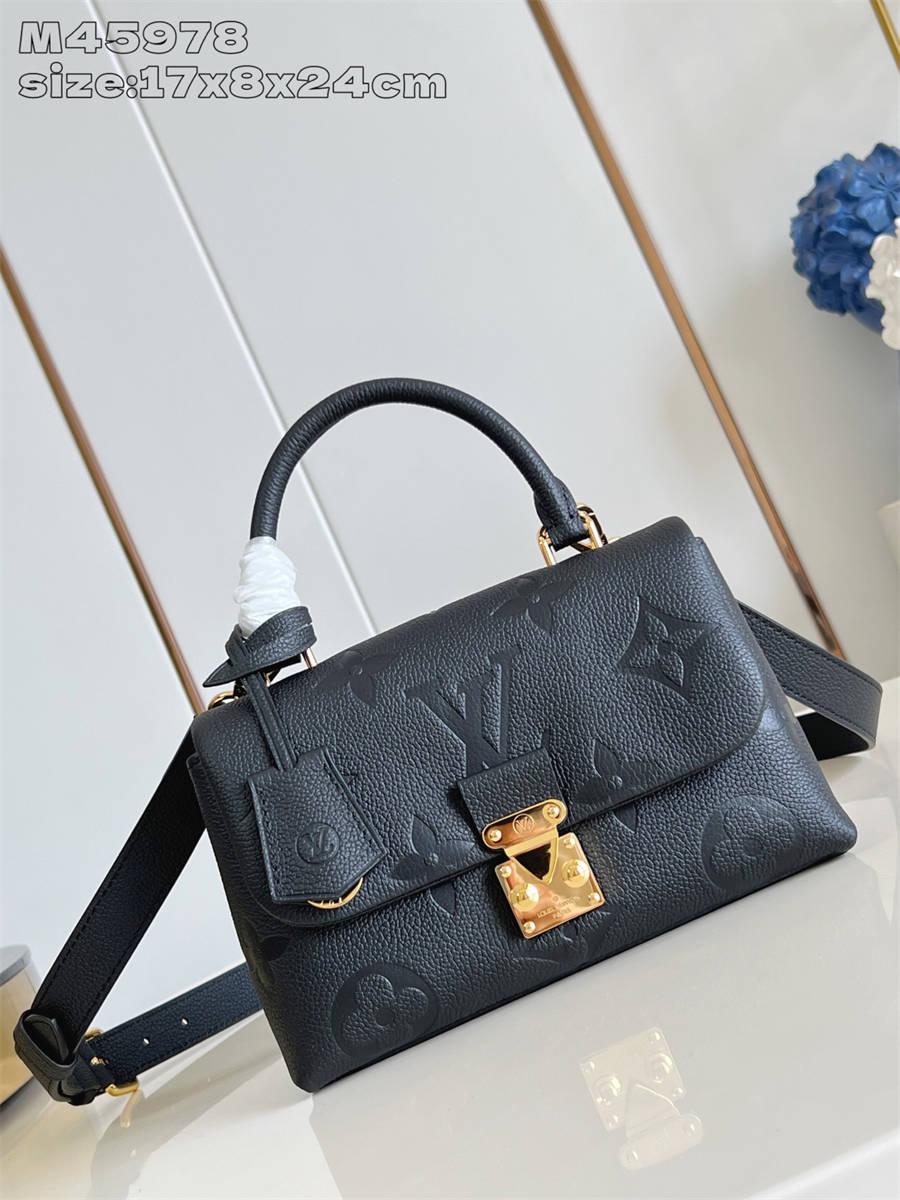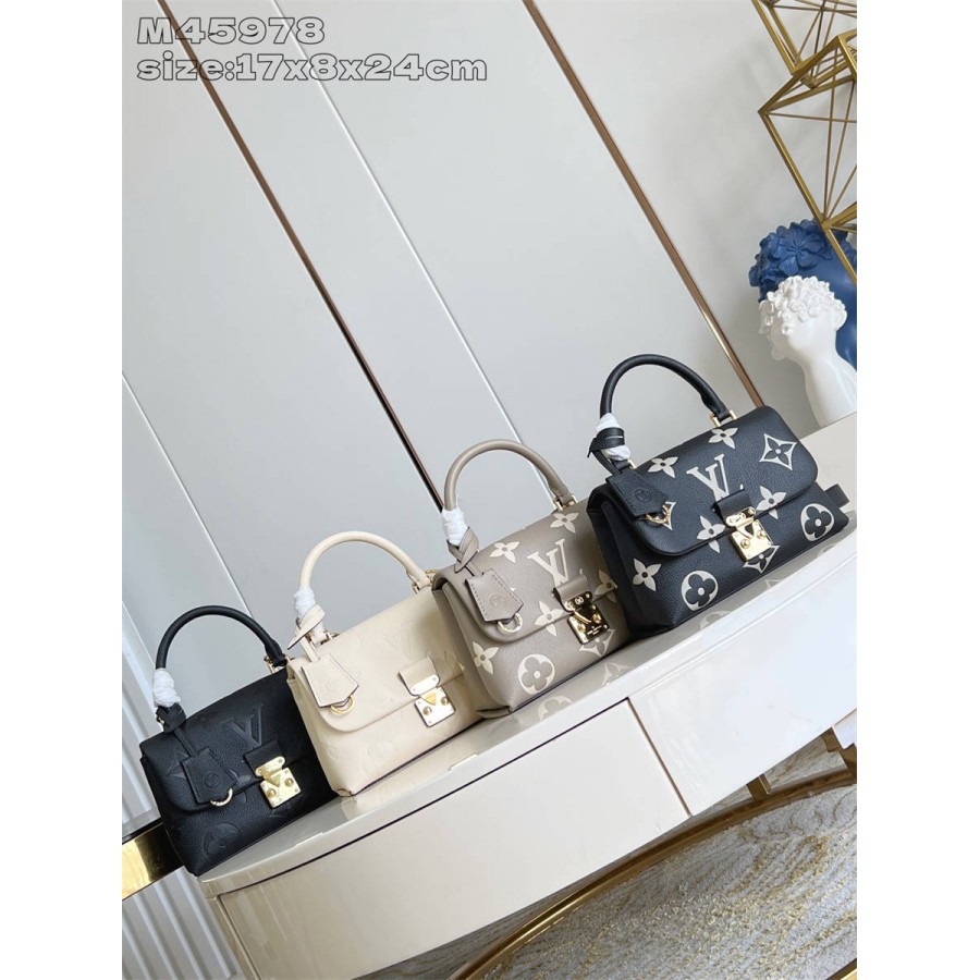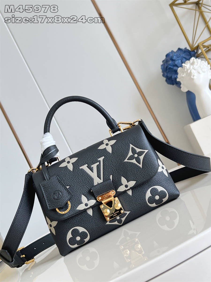 IIK【独家实拍 M45978黑丝印 】本款 Madeleine BB 手袋为 Monogram Empreinte 皮革铺陈大号 Monogram 压纹和印花,其 S-lock 锁扣在 Pochette Métis 手袋中亦有呈现。巧用顶部单手柄和可拆卸肩带,优雅切换背携方式。17 x 8.5 x 24 厘米 (高 x 宽 x 长度)