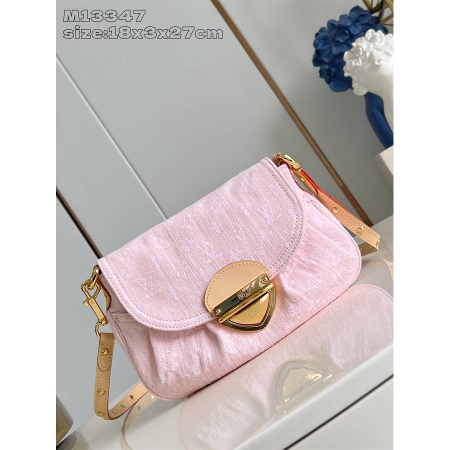 HKK【独家实拍 M13347粉 】本款 Sunset 手袋依托精湛漂白工艺,令诞生于 2005 年的 Monogram Denim 图案回归新季视野。光滑皮革饰边和金属插扣点亮考究构型,可轻松收纳昼夜所需。巧用随附肩带,手提、肩背、斜挎自如切换。18 x 3 x 27 厘米 (高 x 宽 x 长度)