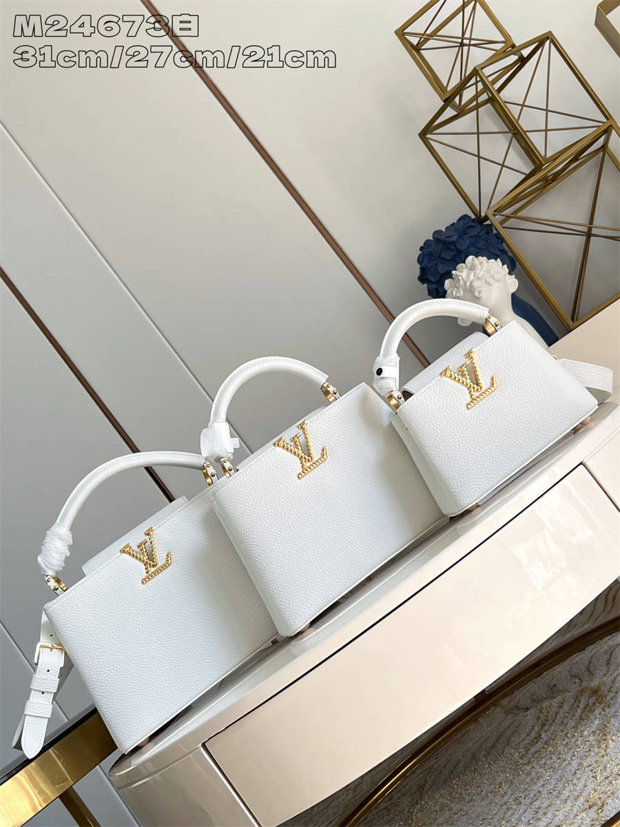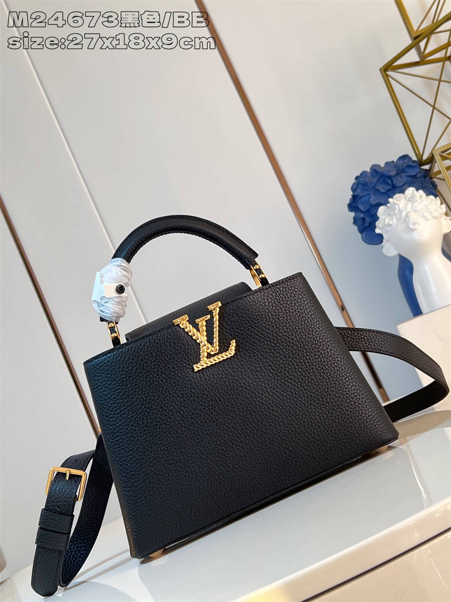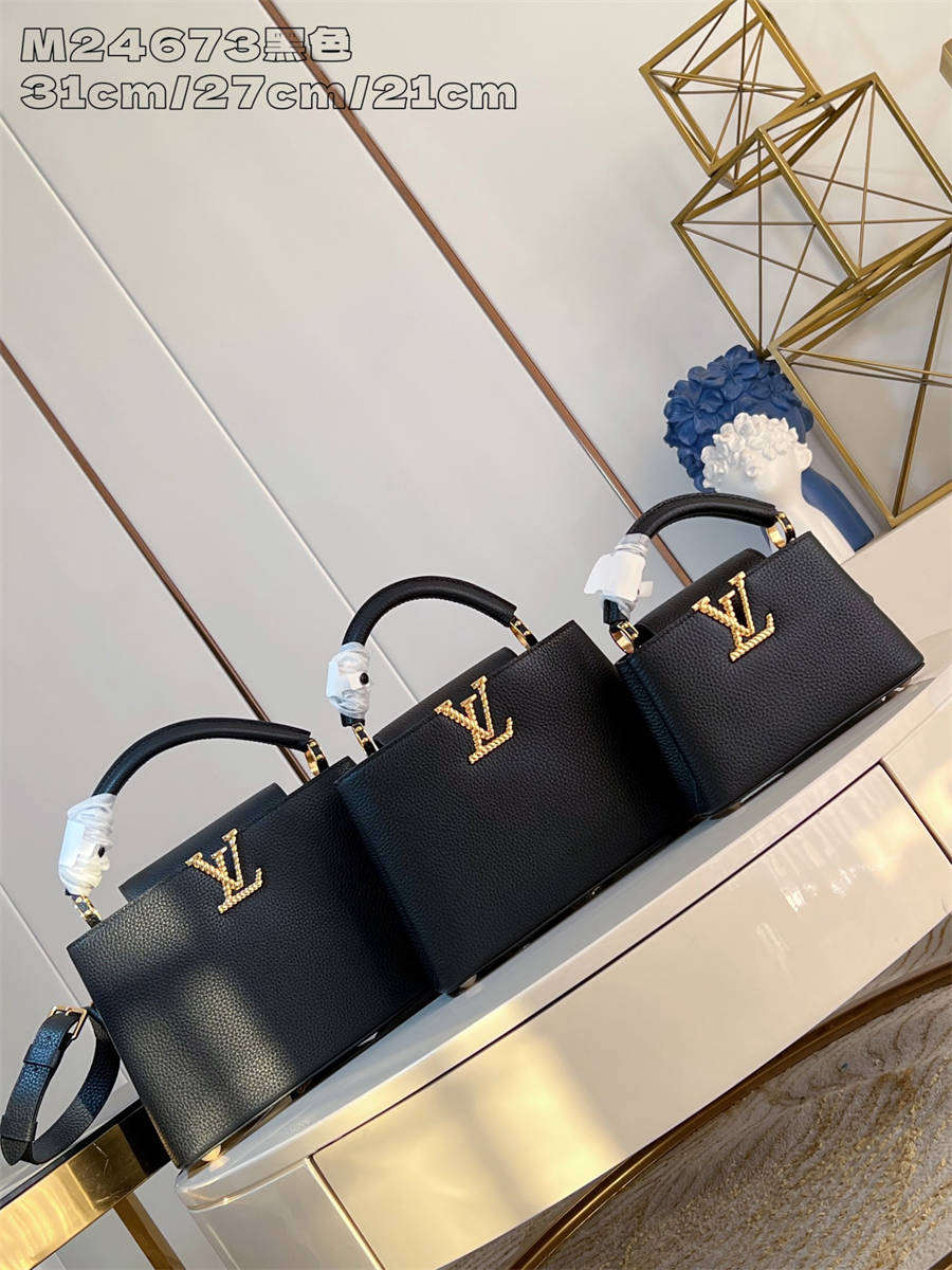 【独家实拍 M24673黑/中号 】本款 Capucines MM手袋取材细腻 Taurillon 牛皮革,以莹亮手柄环和标志性 LV 字母点亮袖珍构型。巧用可拆卸肩带,肩背斜挎自如转换。BBKK BCKK BDKK