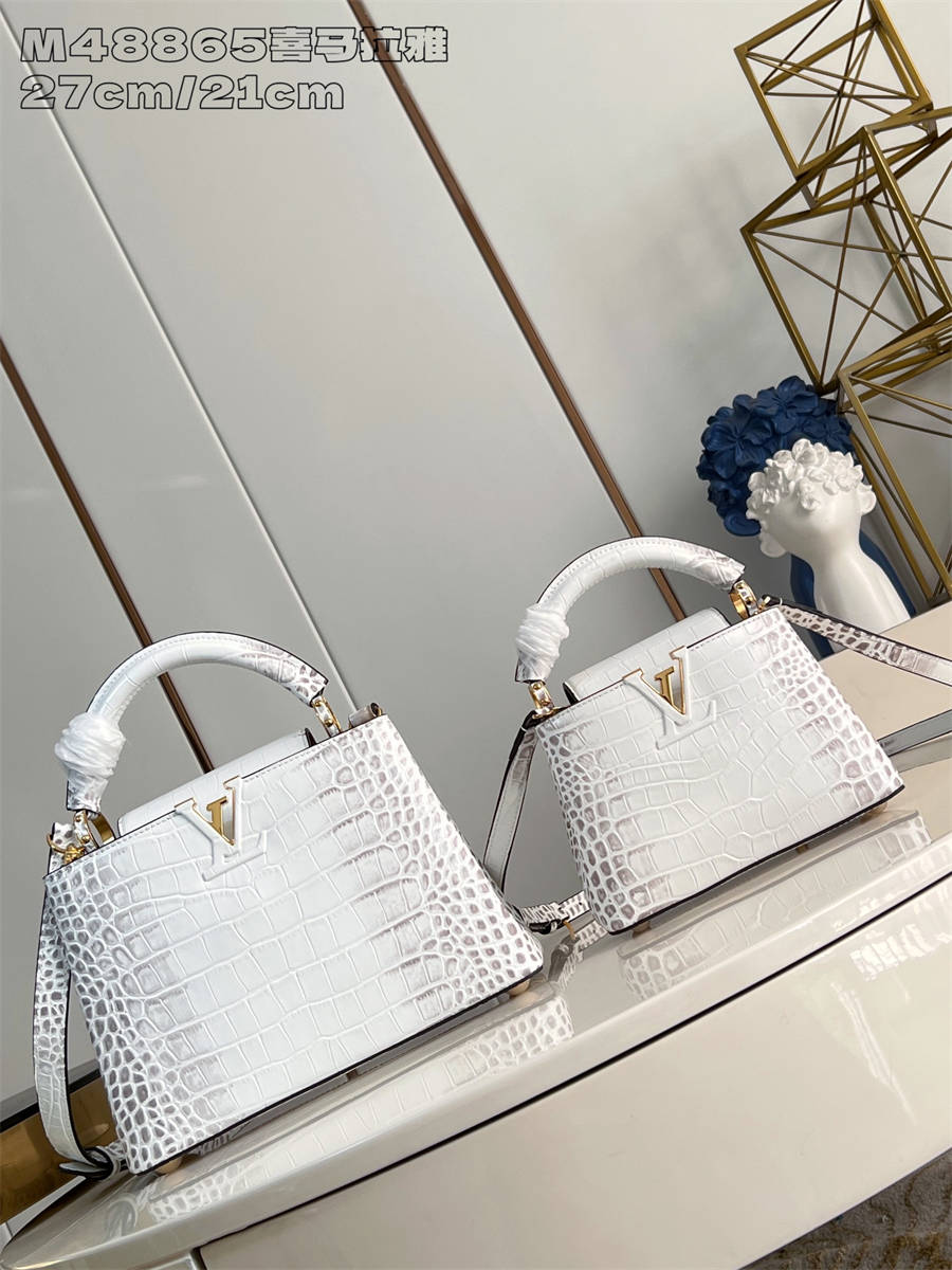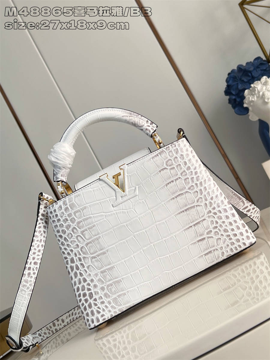 【独家实拍 M48865喜马拉雅/小号】Capucines BB 手袋由鳄鱼皮制成,经上光处理,闪耀迷人。奢华的山羊皮衬里与闪闪发光的金属饰件,特有的 Capucines搭盖既可收入包内,展示字母标识,又可外翻。BBFK BCFK