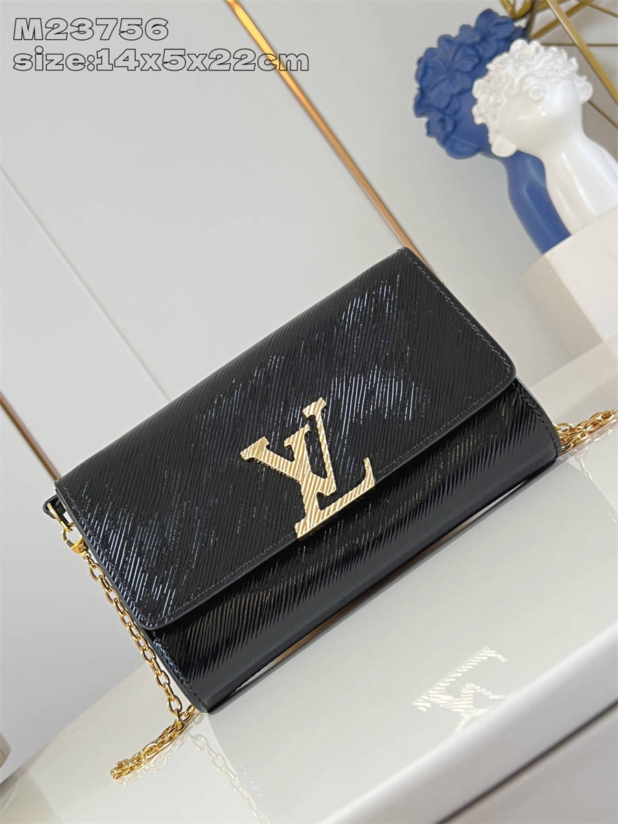 IKK【独家实拍 M23756黑 】本款 Pochette Louise 链条包以崭新尺寸重返视野,借创意笔触演绎考究锁扣。莹亮 Epi 皮革或深邃漆面皮革搭配耀目链条,实现肩背或手拿的自如转换,可为晚装造型点亮瞩目一隅。14 x 5 x 22 厘米 (高 x 宽 x 长度)