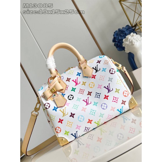 IKK【独家实拍 M13085白彩 】本款 Speedy Bandoulière 25 手袋为经典 Monogram 图案渲染日本艺术家村上隆笔下的明丽色调,与蝴蝶结造型钥匙包一道彰显路易威登 x 村上隆合作系列的灵动风采。牛皮革塑造 Toron 手柄和可拆卸并调节的肩带,耀目挂锁和包角援引品牌行李箱元素。19 x 15 x 25 厘米 (高 x 宽 x 长度)