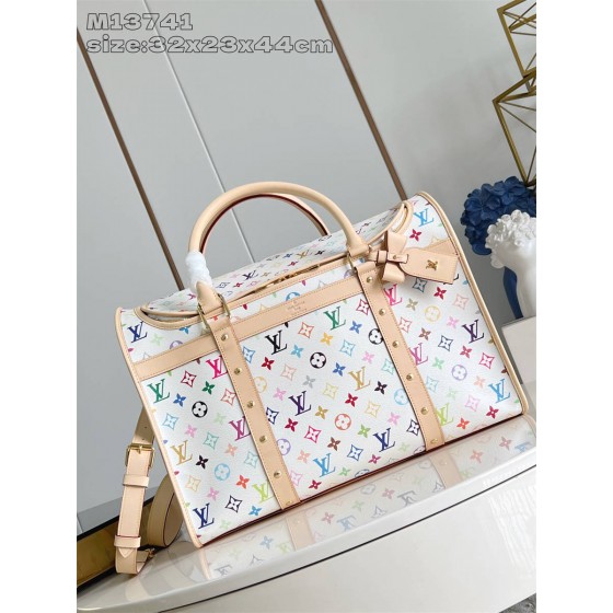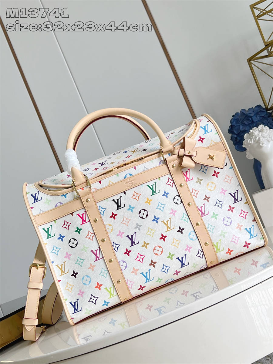 BEKK【独家实拍 M13741白彩 】本款犬用宠物包取材 Monogram 涂层帆布,以路易威登 x 村上隆再版系列的彩虹色调焕新设计,搭配蝴蝶结造型名牌。牛皮革饰边和侧面铆钉饰带彰显考究笔触,可拆卸软垫和透气网罩再添功能细节。顶部手柄和可调节肩带实现轻松背携。32 x 23 x 44 厘米 (高 x 宽 x 长度)