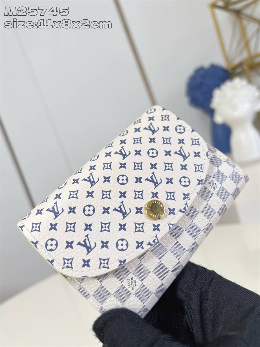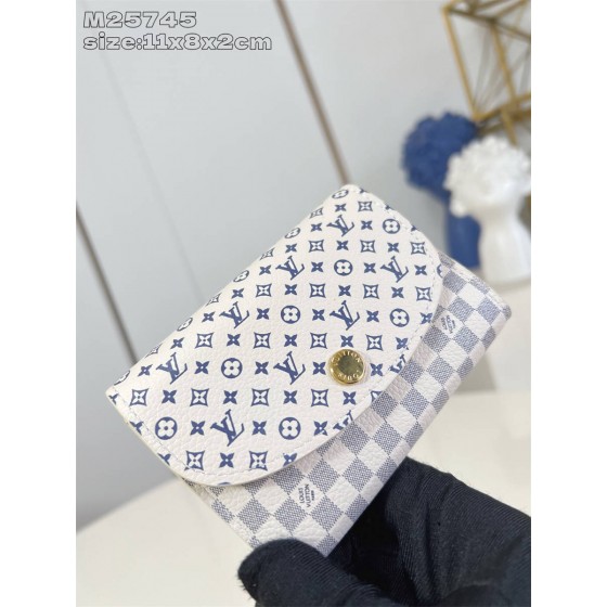 CCK【独家实拍 M25745 】這款Rosalie零錢包於LV Romance系列中重新演繹,並配上今季柔美的色調。典雅的全新版本以小牛皮搭配牛皮製造,巧妙運用品牌的Damier Azur圖案及Monogram圖案締造玩味對比。尺寸小巧玲瓏,設有多個存放貴重物品的口袋,另有兩個名片夾層。11 x 8 x 2.5 厘米 (長度 x 高度 x 闊度)