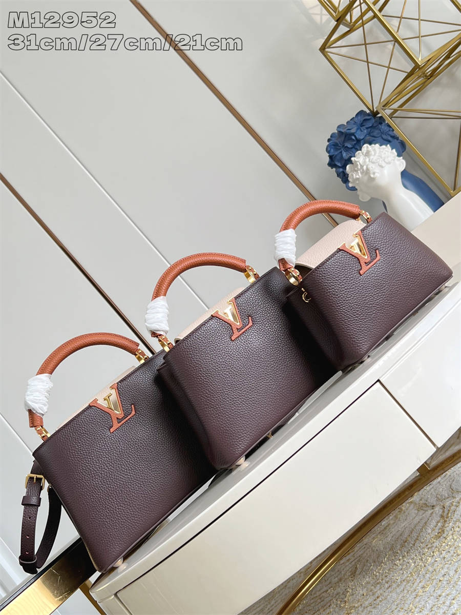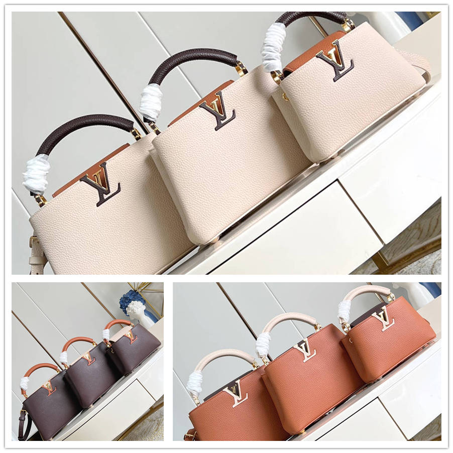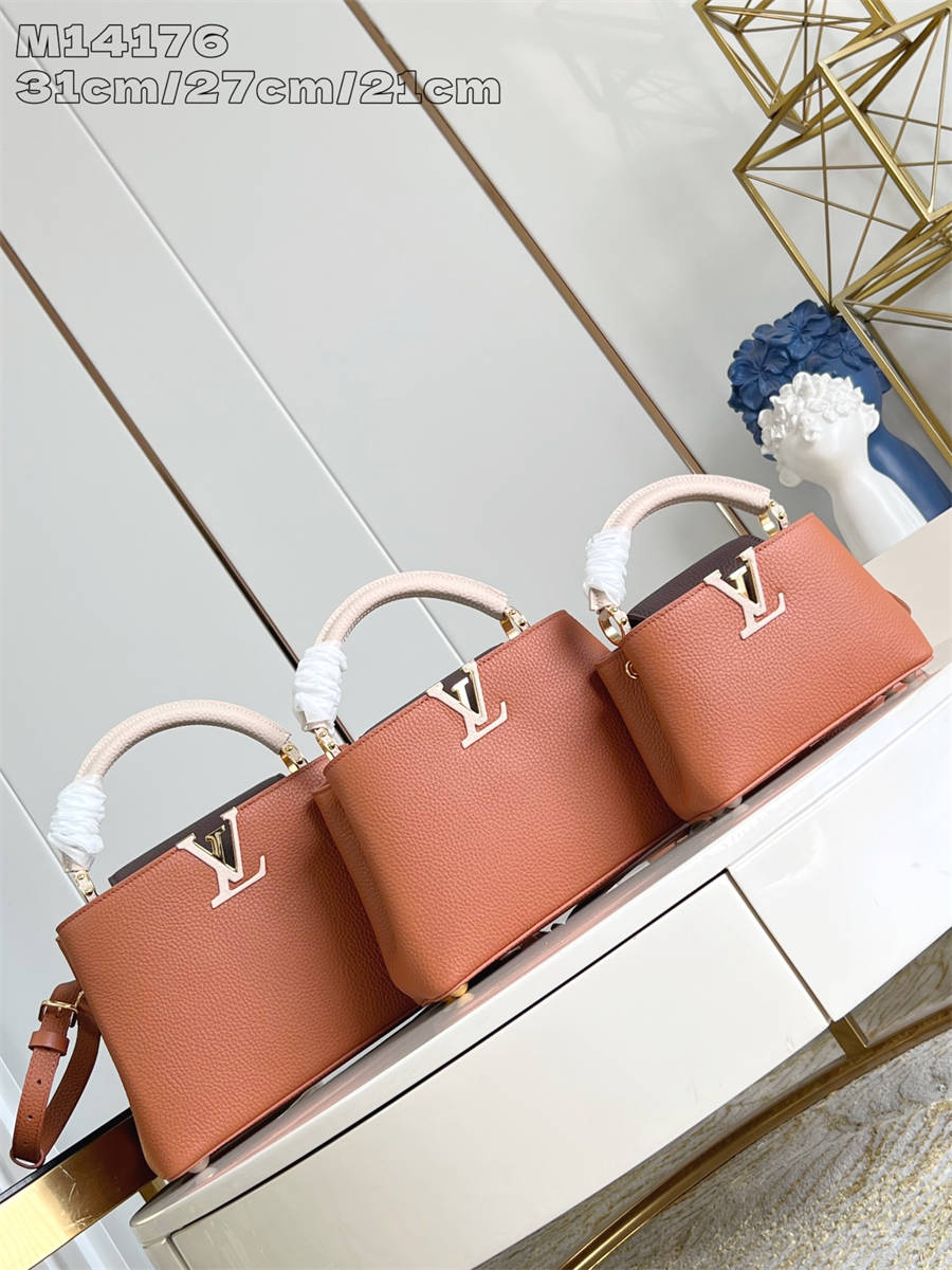 【独家实拍 M14176棕色拼/迷你 】本款 Capucines 迷你手袋为华美 Taurillon 牛皮革渲染新季典雅色调,以耀目金属件和 LV 字母点睛细节。可外置或内收的翻盖开启齐整内层,拉链口袋便于稳妥收纳贵重物品,可拆卸并调节的肩带实现灵活背携。BCKK BDKK BEKK