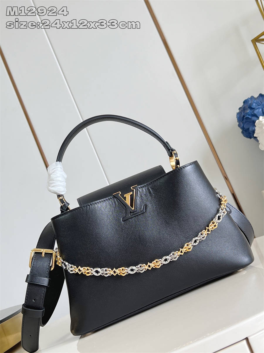 BFKK【独家实拍 M12924黑 】本款 Capucines Souple 中号手袋取材柔软粒面牛皮革,以标志性钥匙包和别致宝石装饰点睛一隅。可外置或内收的翻盖开启充裕空间,令手机等日常所需潮流随行。手提或肩背皆宜 24 x 12 x 33 厘米(高 x 宽 x 长度)