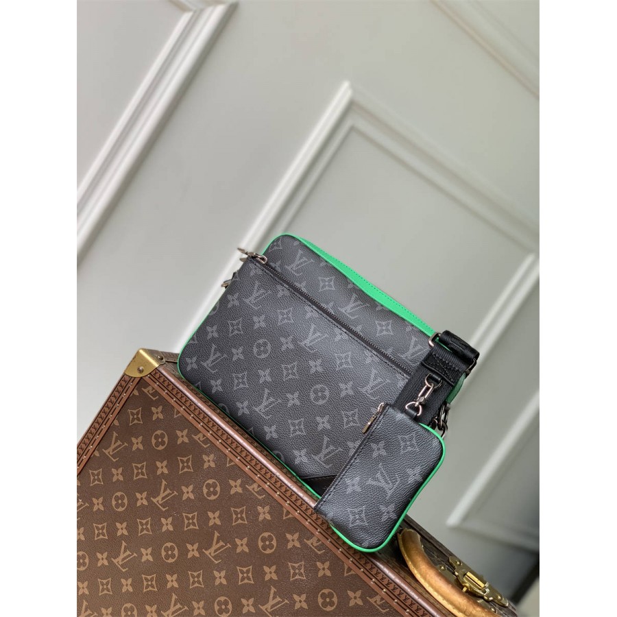 M25052黑花配绿皮 本款 Trio 邮差包取材 Monogram Eclipse 涂层帆布,以鲜明牛皮革彰显摩登风尚。拉链前袋固定于主隔层,肩带处配有小号零钱包,二者均可取下单独使用。
