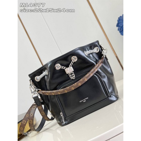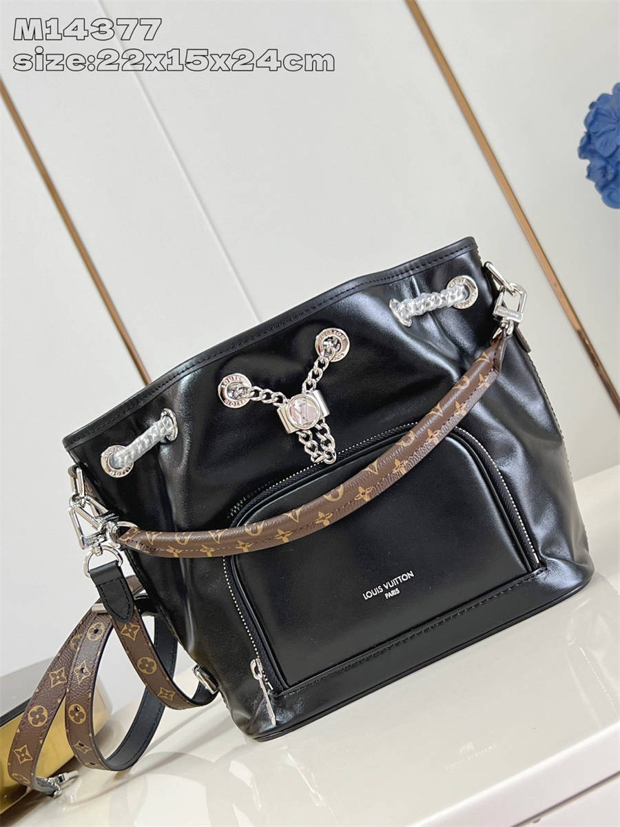JKK【独家实拍 M14377/升级版 】No Way 手袋出自 LV Vibe 系列,为羊皮革融入莹泽金属件,以摩登摇滚型格焕新经典 Noé 手袋元素。LV Circle 滑动装饰方便调节开口,拉链前袋可随心收纳钥匙和化妆品。22.5 x 15.5 x 24 厘米 (高 x 宽 x 长度)