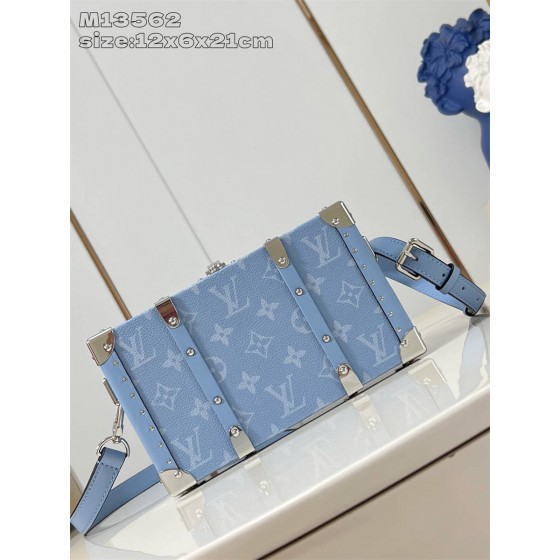 IFK【独家实拍 M13562蓝 】本款 Wallet Trunk Taigarama 手袋取材 Monogram 帆布和牛皮革,以木条框架、搭扣和加固包角道出品牌经典硬箱的灵感启发。充裕内里便于收纳手机与钱夹,可拆卸肩带令肩背斜挎切换自如。12.3 x 6 x 21.5 厘米 (高 x 宽 x 长度)