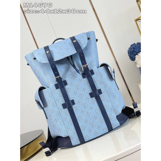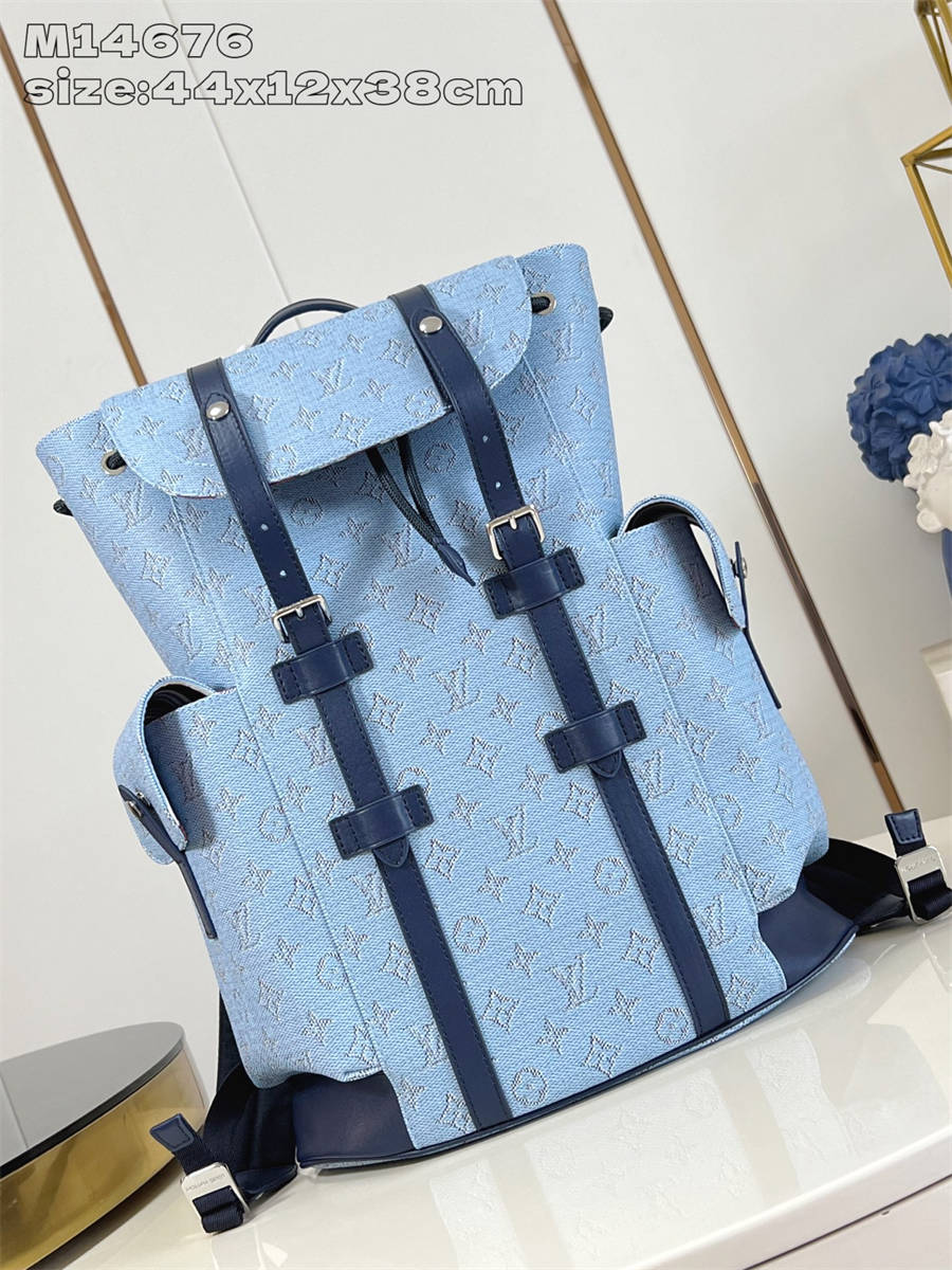 IFK【独家实拍 M14676蓝 】本款 Christopher 中号双肩包为 Monogram Heritage 涂层帆布浸染崭新色调,巧妙致意航海旅行和远洋邮轮。皮革勾勒俊朗轮廓,搭扣衔接竖向饰带,宽敞构型配有条纹织物内衬。44 x 12.5 x 38 厘米 (高 x 宽 x 长度)