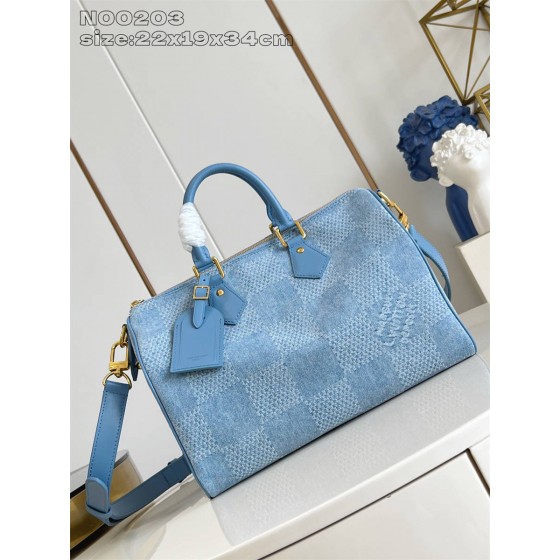 HFK【独家实拍 N00203 】本款 Speedy 30 Bandoulière 手袋采用 Pharrell Williams 为路易威登成衣系列设计的 Damier Denim 3D 棉质帆布,以闲适格调重塑品牌 Damier 格纹,赋予后者经典都市气息。顶部手柄和可拆卸并调节肩带提供多种背携选择。22 x 19 x 34 厘米 (高 x 宽 x 长度)