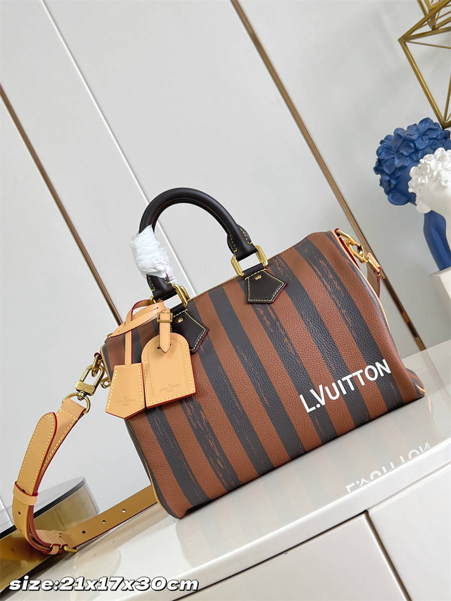 BCFK【独家实拍 卡其条30cm 】Speedy Soft 30 Crafty 手袋以惬意之姿相伴旅途。Monogram 涂层帆布带来柔软质感,皮革内衬与钥匙包融入瞩目笔触,登机牌和硬箱装饰彰显玩趣巧思。拉链内袋可妥善存放护照和其他重要物品,Toron 手柄再添华美一笔。21 x 17 x 30 厘米 (高 x 宽 x 长度)