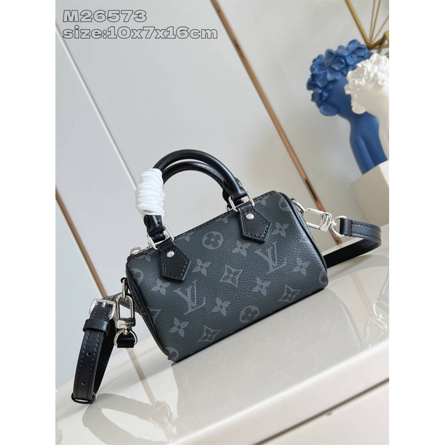GKK【独家实拍 M26573 】本款 Nano Speedy 手袋采用帆布塑造玲珑构型,以 Monogram Eclipse 图案传递优雅风尚,轻松点亮昼夜造型。莹泽金属件流露考究气息,充裕空间可容纳短款钱夹等日常所需,可拆卸肩带实现多种背携方式。10 x 7.5 x 16 厘米 (高 x 宽 x 长度)