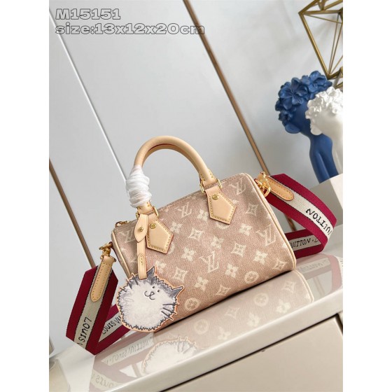 HKK【独家实拍 M15151 】本款 Speedy 20 Bandoulière 手袋取材 Meowgram 帆布,瞩目亮相品牌与 Vogue 前创意总监打造的 LV Travels With Grace Coddington 合作系列。可爱猫咪造型挂饰和皮革手柄丰富细节,挂锁等金属件再添考究笔触。13.5 x 12 x 20.5 厘米 (高 x 宽 x 长度)