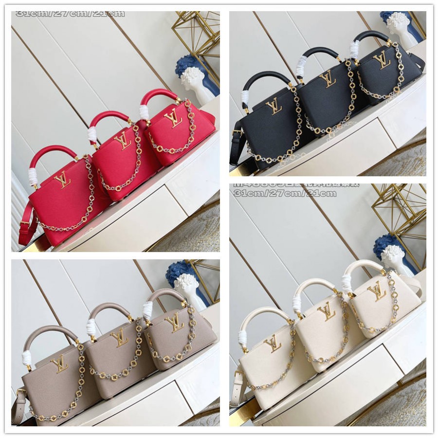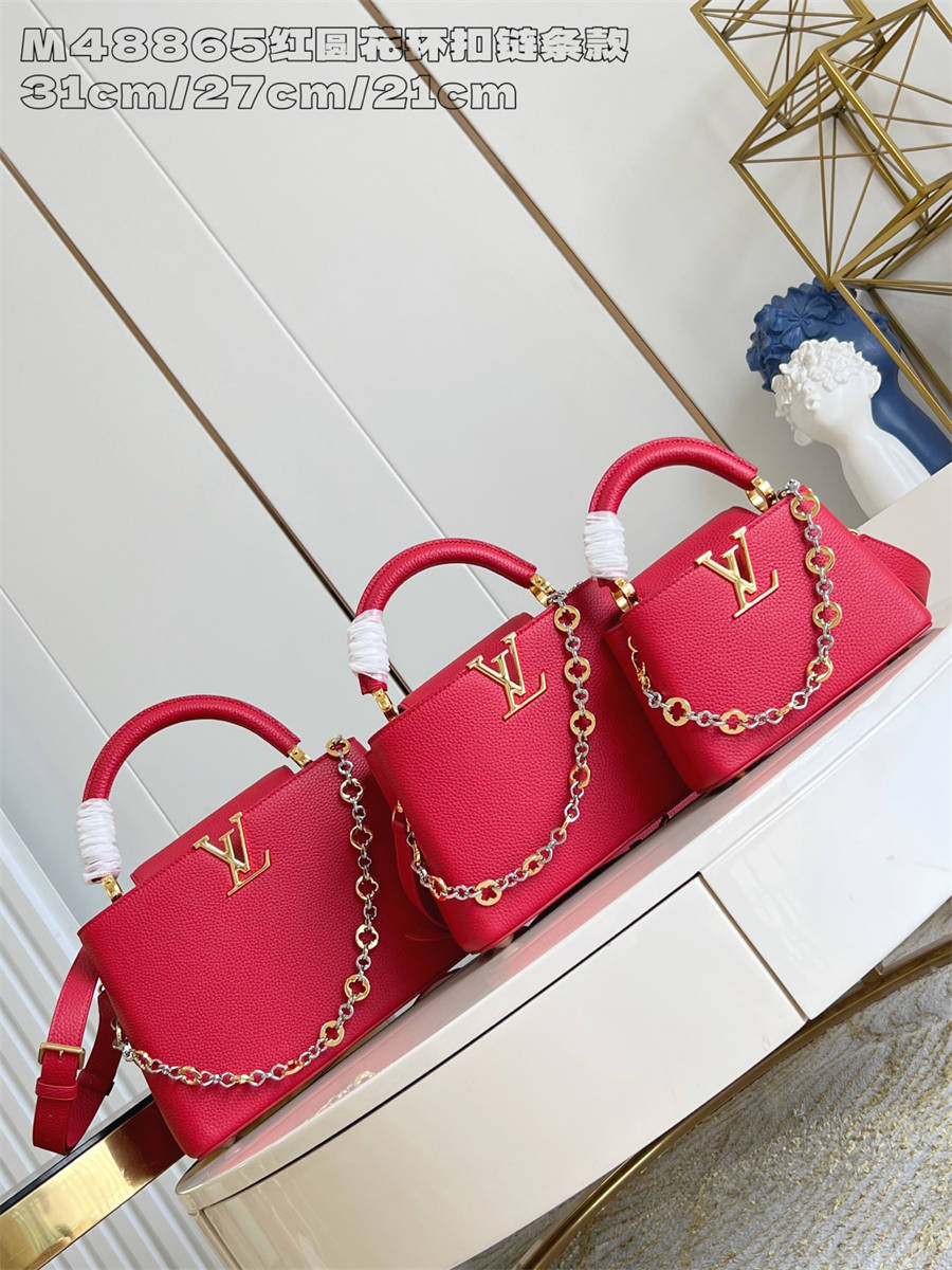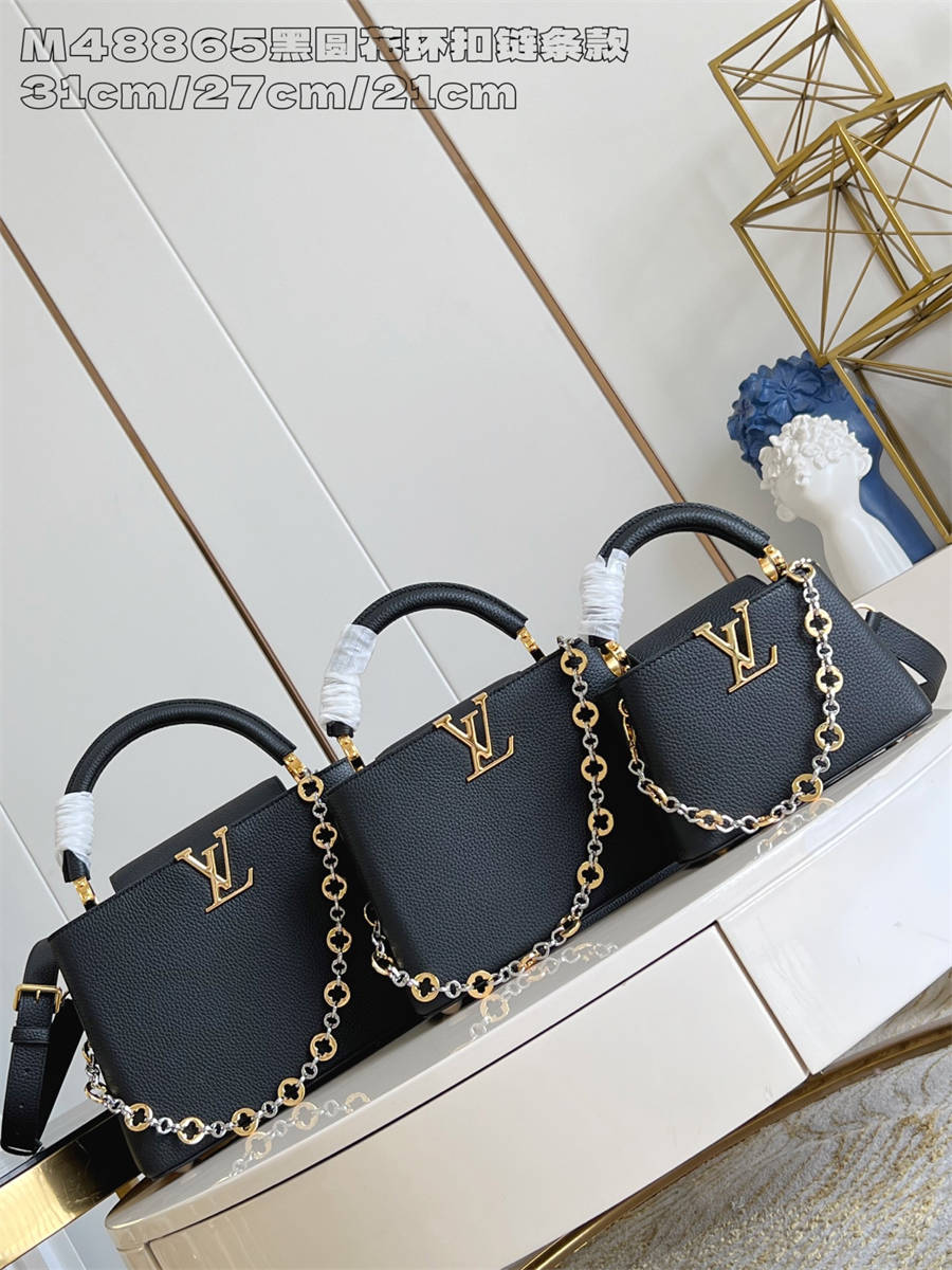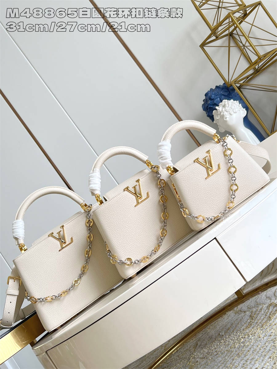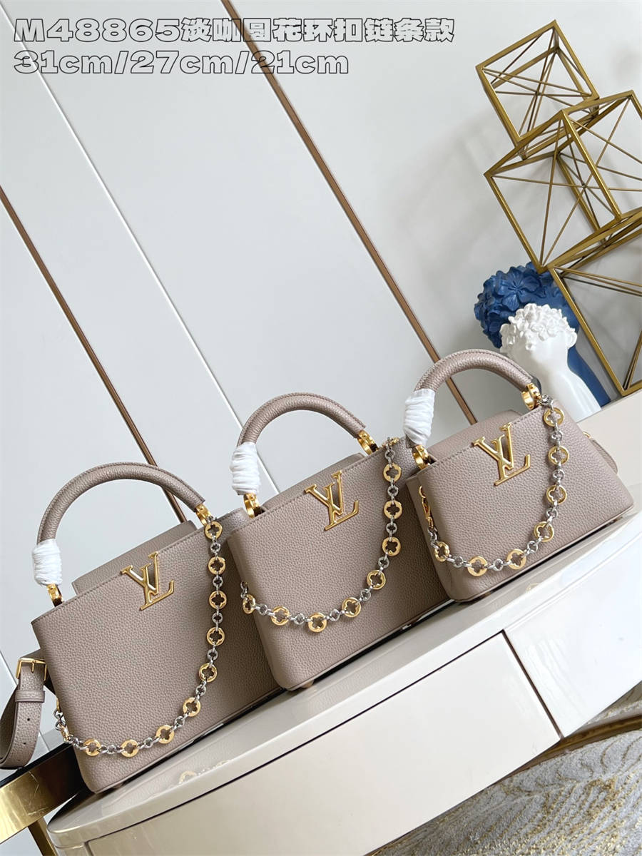 【独家实拍 M48865淡咖圆花环扣链条/中号 】M12935 本款 Capucines 中号手袋出自 Chain On You 系列,以 Taurillon 牛皮革聚焦品牌匠心巧思与精良工艺。珠宝风格双镀链条点缀 Monogram 花卉,圆润 LV 字母和金属件再添考究笔触。无论斜挎、手提或肩背,均可展露优雅格调。BDKK BEKK BFKK