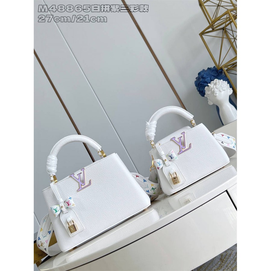BDKK BEKK【独家实拍 M48865白拼紫三彩款/迷你 】本款 Capucines 迷你手袋出自路易威登 x 村上隆再版系列,选用 Taurillon 牛皮革妙趣演绎经典设计。LV 字母和可拆卸 Monogram 肩带浸染明丽色调,致意艺术家标志性的虹彩笔触。蝴蝶结造型钥匙包和挂锁装饰再添考究细节,内隔层和多重口袋可轻松收纳日常所需。