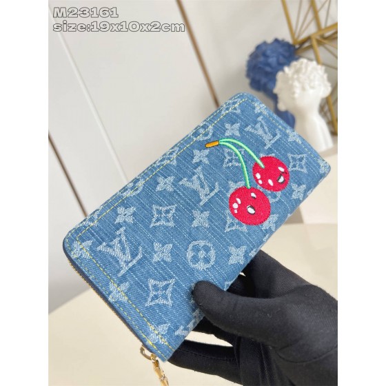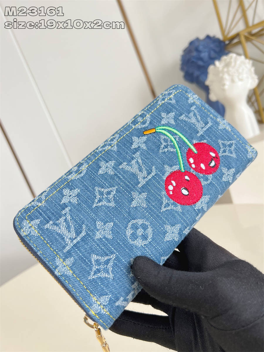 DCK【独家实拍 M23161 】這款必備的拉鏈錢包以玩味風格重新演繹,以享負盛名的Louis Vuitton x Murakami第二版跨界聯乘系列設計登場。錢包以品牌的標誌性Monogram牛仔布製造,並綴有特大櫻桃圖案,呈現日本藝術家村上隆可愛設計的美學,注入歡樂的個性細節。錢包採用金色拉鏈設計,並內置多個可井然有序地存放名片、零錢及紙幣的隔層。19.5 x 10.5 x 2.5 厘米 (長度 x 高度 x 闊度)