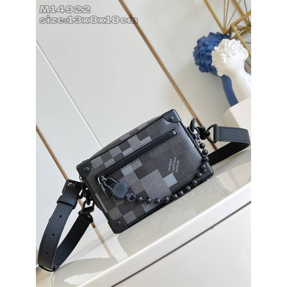 HKK【独家实拍 M14922 】本款 Mini Soft Trunk 手袋为 Damoflage Black 涂层帆布搭配牛皮革饰边,并于小巧包身铺陈 Pharrell Williams 笔下的像素化 Damier 图案,尽情演绎摩登风尚。辊压皮革顶部手柄与可拆卸并调节的肩带提供多种背携选择。13 x 8 x 18.5 厘米 (高 x 宽 x 长度)