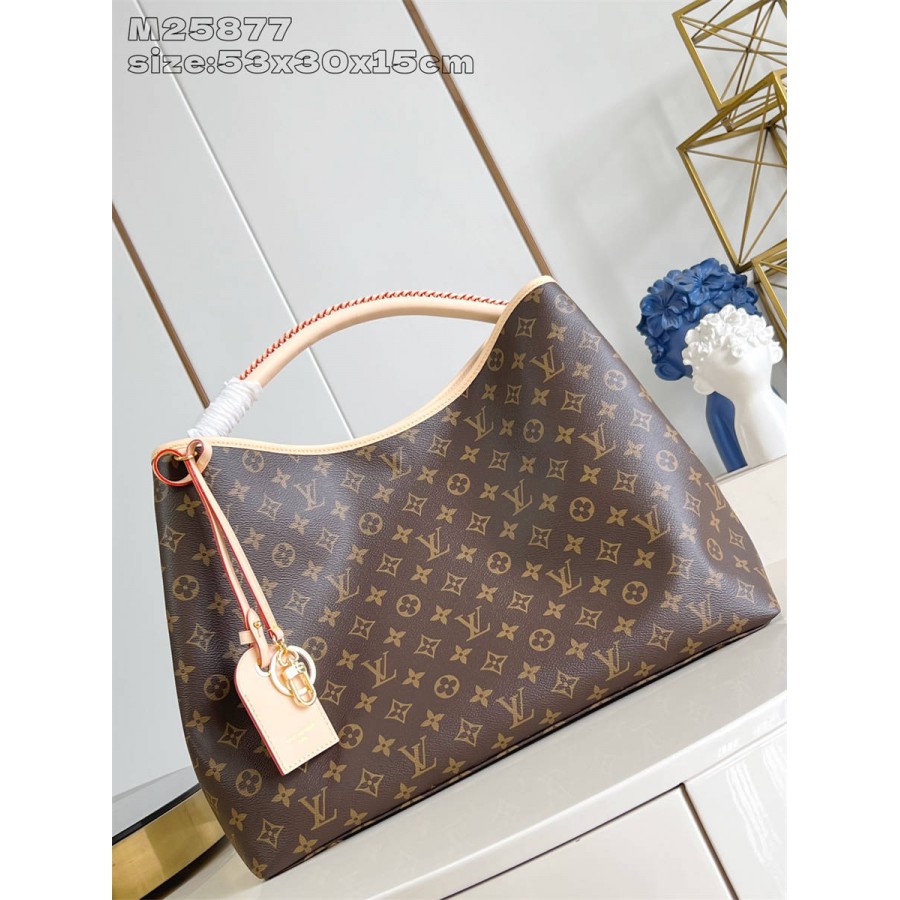 HKK【独家实拍 M25877 】Damier Artsy手袋以柔软的Monogram帆布制成,外观清新而富有女人味。搭配闪亮的金色黄铜配件和时尚别致的包饰,精美手工制成的皮质手柄更添奢华质感,尺寸:53x30x15.5cm