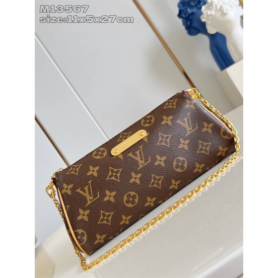 EFK【独家实拍 M13567老花 】本款 Pochette Eva 手袋为品牌 Monogram 帆布搭配撞色皮革饰边,以别致笔触传递典雅风范。路易威登铭纹标识牌和可拆卸链条相得益彰,恰宜构型便于收纳短款钱夹和化妆品等日常所需。11 x 5 x 27 厘米 (高 x 宽 x 长度)