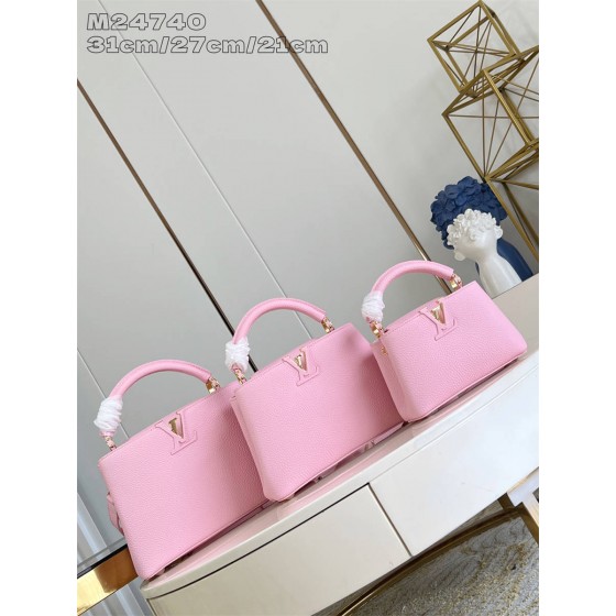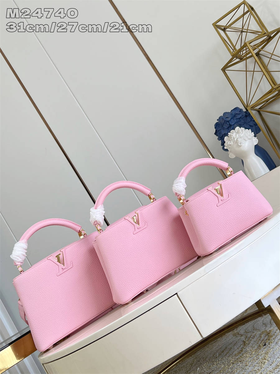 【独家实拍 M24740粉/小号 】本款 Capucines BB手袋以 Taurillon 牛皮革塑造经典构型,尽显品牌传承和精湛匠艺。翻盖提供外置或内收两式风尚,齐整内里设有多重口袋,耀目金属件流露雅致气息。BBFK BCFK BDFK