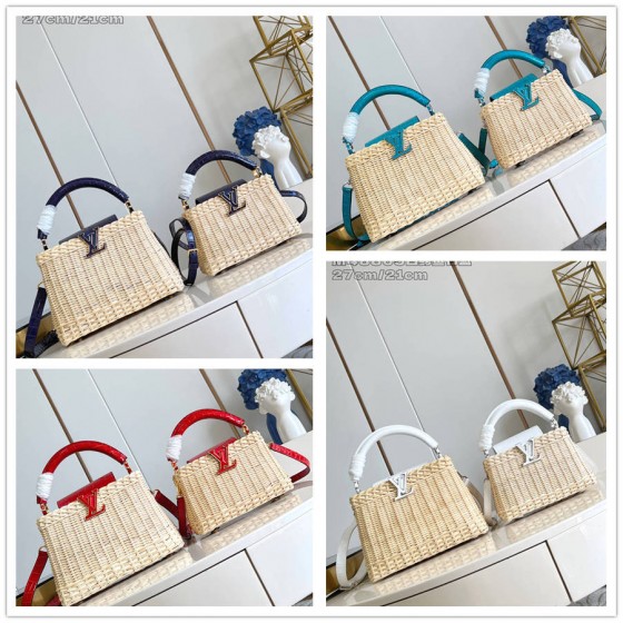 【独家实拍 M48865红鳄鱼竹篮/迷你 】 本款 Capucines 迷你手袋向路易威登于 1892 年推出的 Picnic 硬箱汲取灵感,洋溢浓郁夏日风情。藤条包身需要数天的匠心编织方可完成,皮革饰边和耀目 LV 字母完善细节,斜挎、肩背或手提皆宜。BCFK BDFK