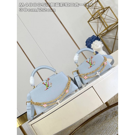 BDKK BEKK【独家实拍 M48865浅灰蓝彩虹二合一链条/迷你 】M13707 本款 Capucines East West 迷你手袋出自路易威登 x 村上隆再版系列 采用横向构型,为品牌经典设计带来新锐解读。华美牛皮革和金属件流露哑光质感,充裕空间可轻松收纳手机、长款钱夹和其他日常所需。可拆卸并调节的皮革肩带实现更多造型可能。