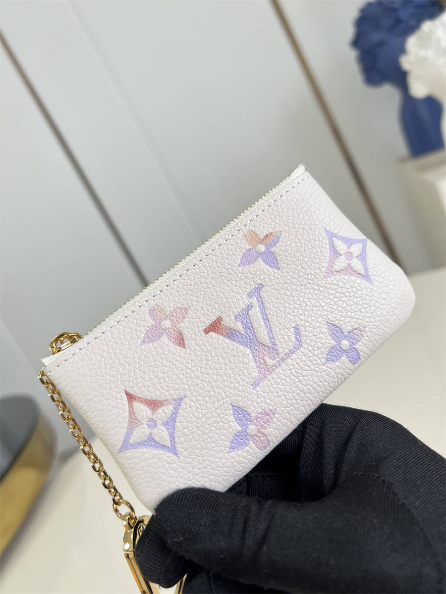 CCK【独家实拍 M25597 】本款钥匙零钱包拥有典雅幻梦色彩,以 Monogram Empreinte 皮革塑造玲珑构型,彰显路易威登的悠久传承和精湛匠艺。链条配有钥匙钩扣。7 x 1.5 x 12 厘米 (高 x 宽 x 长度)