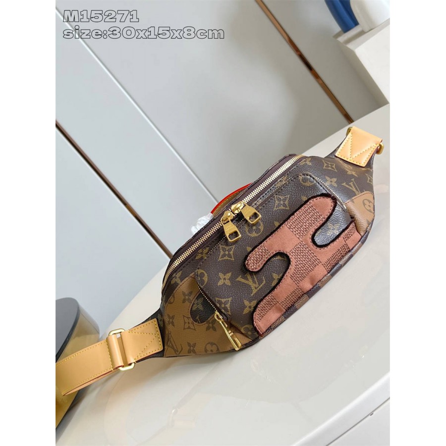 GDK【独家实拍 M15271 】這款Rush Bumbag糅合品牌標誌性Monogram帆布與Damier棋盤格紋圖案,散發迷人魅力。設計以經典的棕色Monogram為基底,綴以Damier及Monogram Reverse貼圖刺繡,營造出獨特的圖案。可調節肩帶提供不同的攜帶方式,可掛在腰間、肩背或斜背攜帶。30 x 15 x 8 厘米 (長度 x 高度 x 闊度)