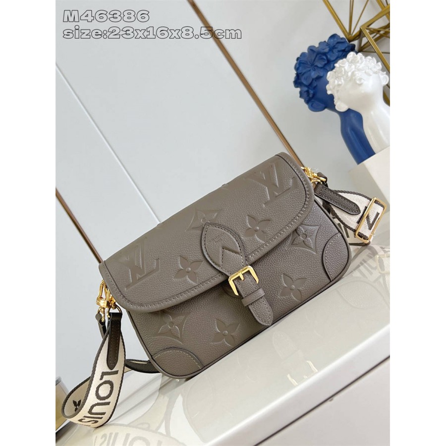 IIK【独家实拍 M46386浅绿压花 】本款 Diane 手袋为 Monogram Empreinte 压纹皮革注入典雅色调,以莹泽金属件和正面搭扣宣示从容格调。可拆卸皮革肩带实现灵活背携,路易威登标识织纹点睛可拆卸斜挎肩带。24 x 15 x 9 厘米(长度 x 高 x 宽)