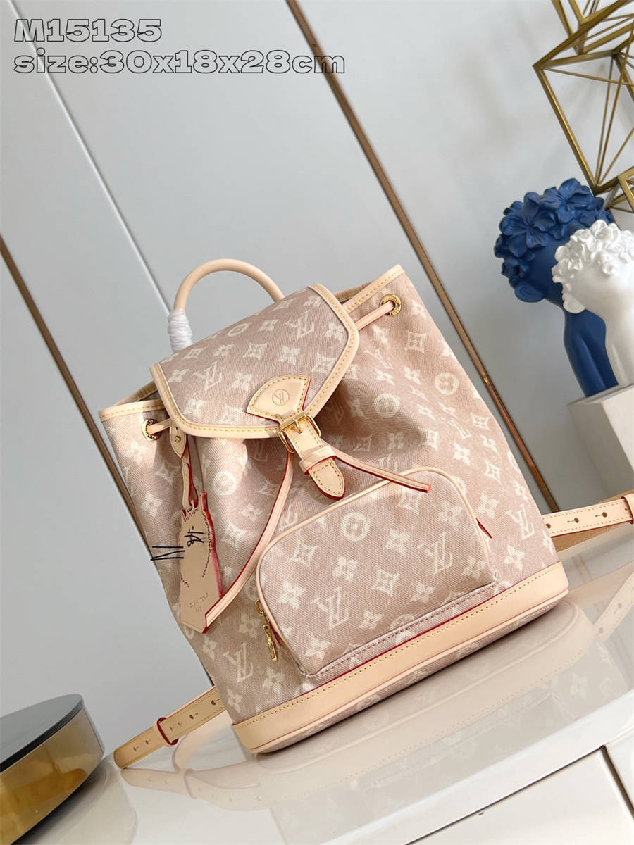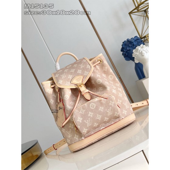HIK【独家实拍 M15135 】本款 Montsouris 小号双肩包出自 LV Travels With 系列,聚焦时尚偶像兼艺术家 Grace Coddington 设计的妙趣 Meowgram 图案,彰显其对猫咪的热爱之情。帆布包身搭配可拆卸猫咪造型钥匙包,充裕空间可收纳日常所需,随附短款钱夹。30 x 18 x 28 厘米 (高 x 宽 x 长度)