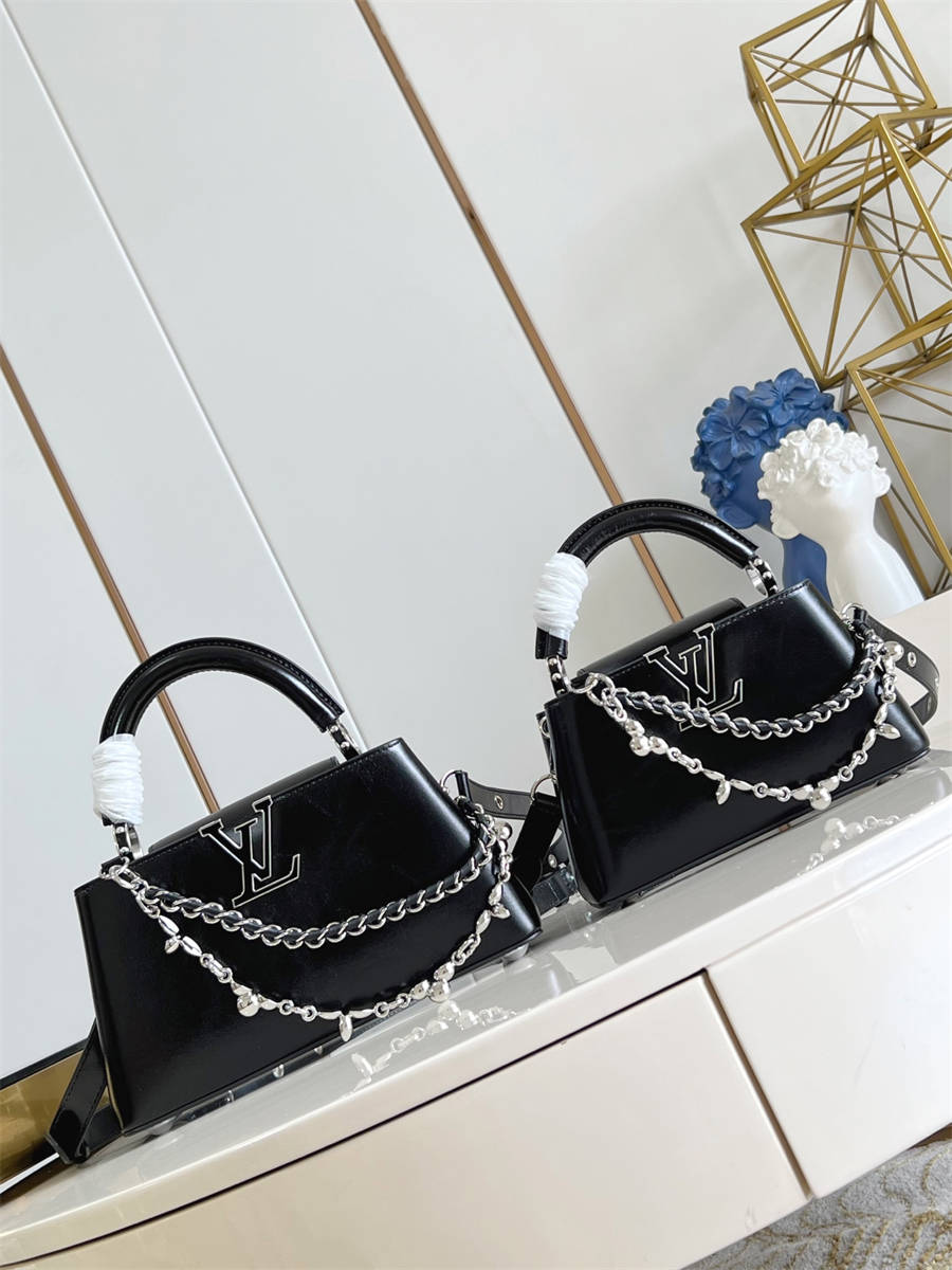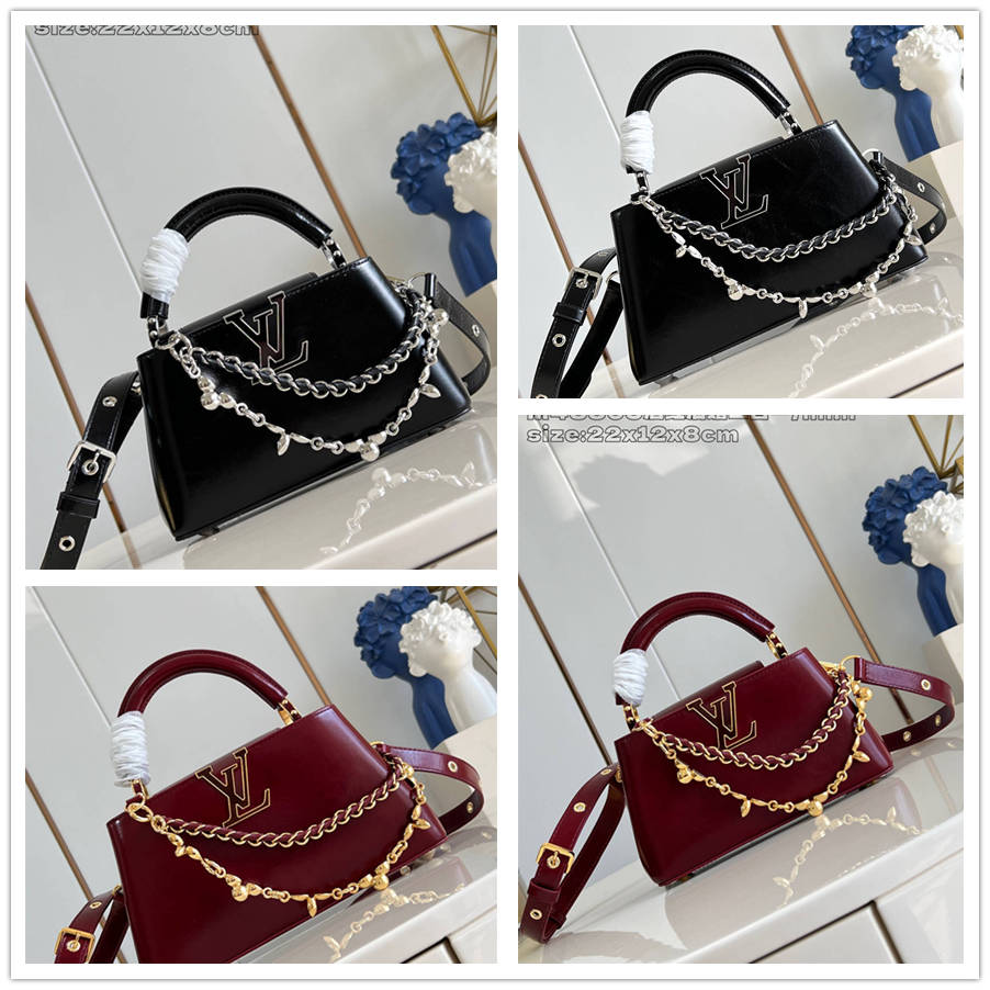 【独家实拍 M48865酒红油蜡二合一/迷你 】M25473 本款 Capucines East-West 迷你手袋向路易威登美妆系列汲取色彩灵感,巧妙展露雍容气度。褶皱皮革包身释放前卫气息,搭配可内收或外置的翻盖。LV 字母彰显品牌印记,莹亮链条可随心拆卸。BDFK BEFK