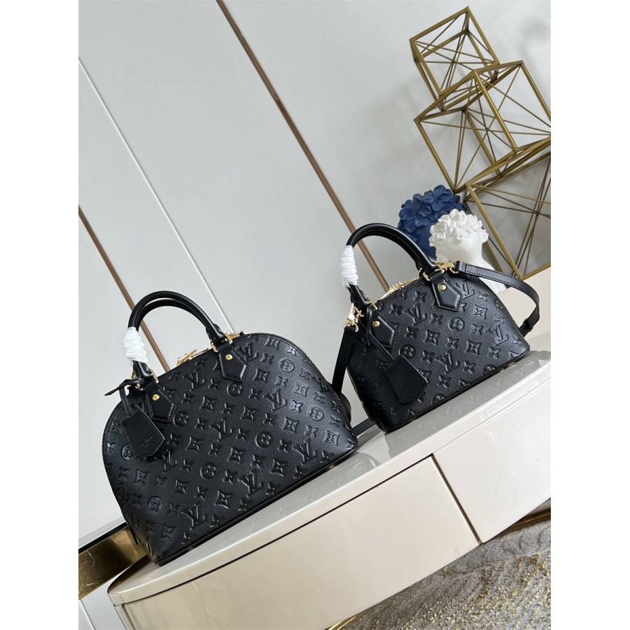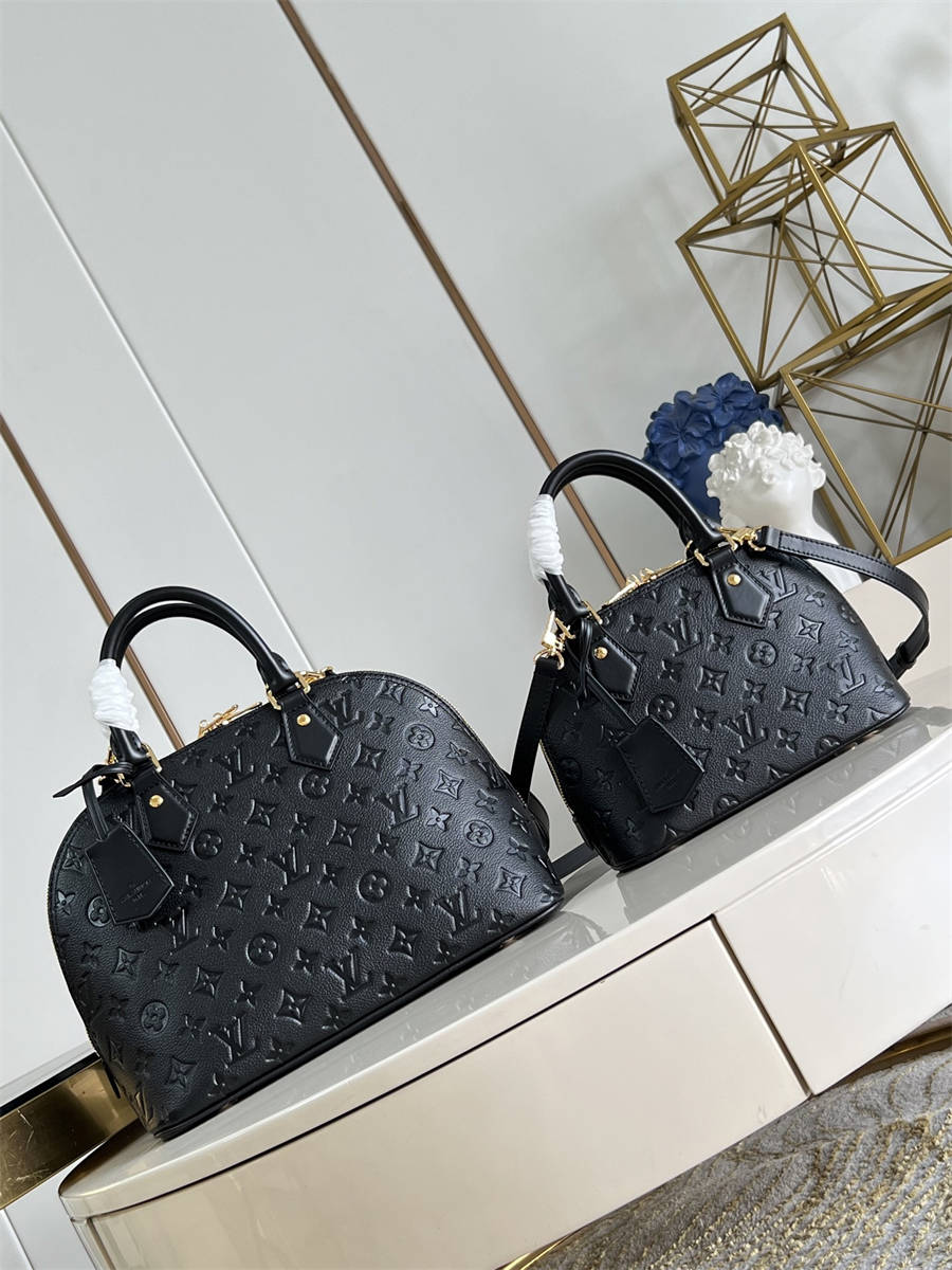 【独家实拍 M26409黑压花 】本款 Alma BB 手袋溯源 1934 年的装饰艺术格调,以 Monogram 帆布塑造雅致构型。耀目挂锁与钥匙、Toron 手柄和皮革钥匙包点睛经典元素,可拆卸并调节的肩带方便斜挎。JKK BKKK