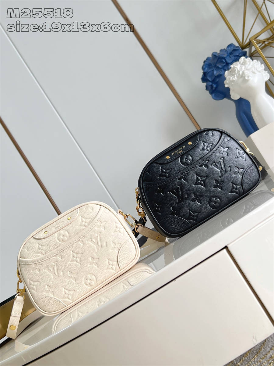 HKK【独家实拍 M25518黑压花 】Monogram Empreinte系列推出了这款具有永恒色彩的Tiny Camera Bag。这款手提包由牛皮制成,采用金色五金设计,带有可调节的肩带,可多种佩戴方式。这款时尚的手提包将兼具白天和夜晚的外观,并适合日常必需品。前平口袋非常适合轻松携带信用卡或旅行卡。19 x 13 x 6 厘米(长x高x宽)