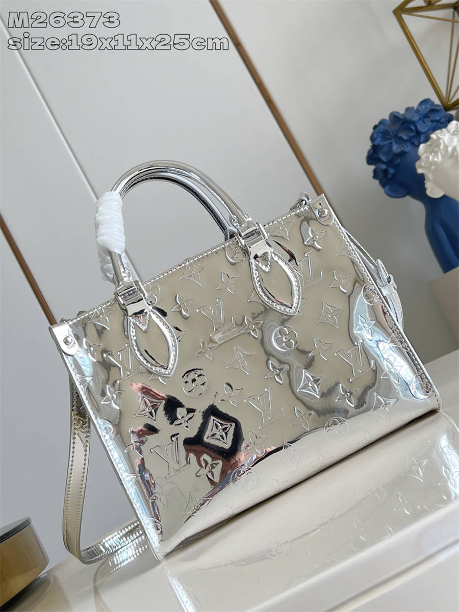 HFK【独家实拍 M26373 】本款 OnTheGo 小号手袋以 Monogram Miroir 版本加入 LV Ski 系列。覆膜帆布确保经久耐用。Silver 色调与同色金属件共释熠熠光芒。内置口袋可收纳小书等日常用品。19 x 11.5 x 25 厘米 (高 x 宽 x 长度)