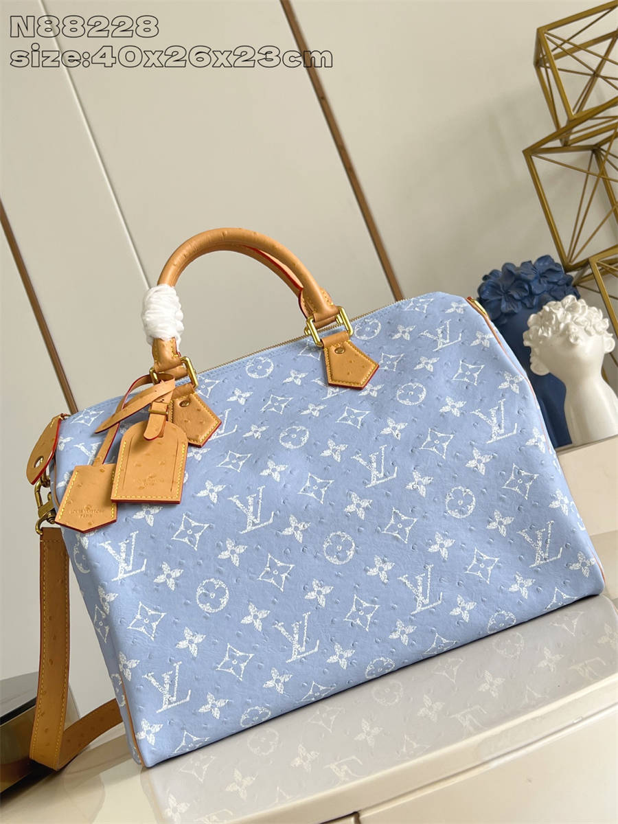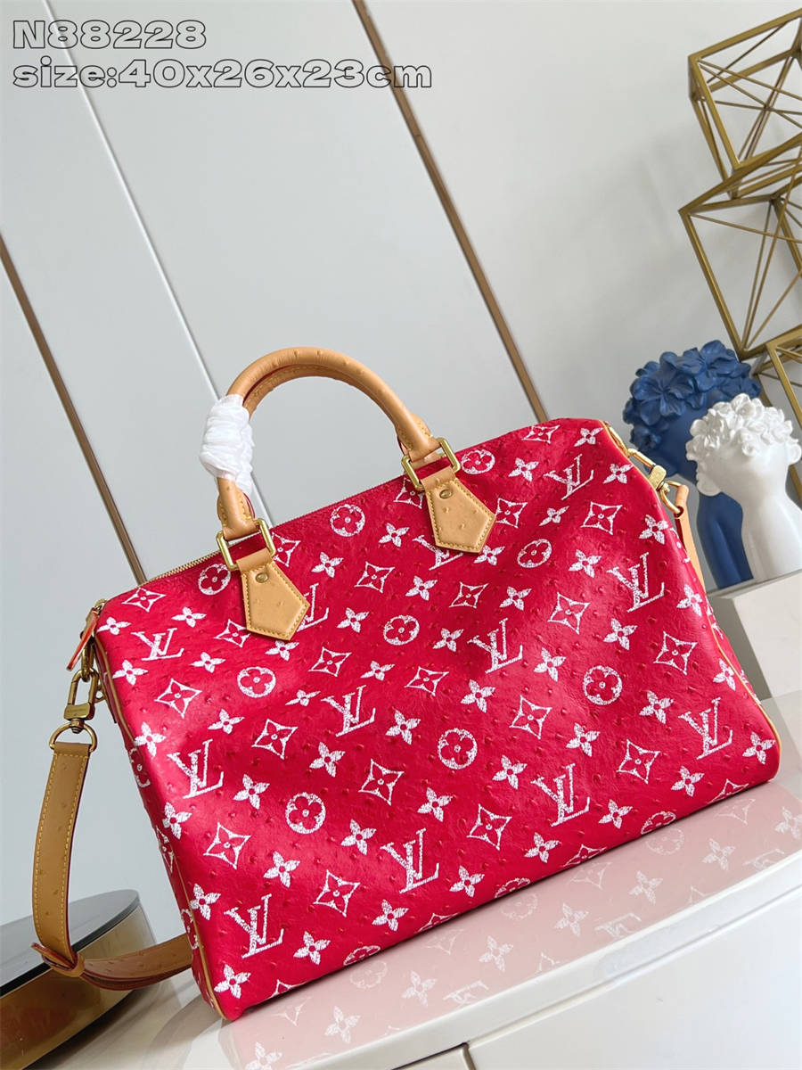 BDKK【独家实拍 N88228鸵鸟纹红色 】本款 Speedy P9 Bandoulière 40 Monogram Leather 手袋为柔软粒面牛皮革包裹羊皮革内衬,以丝印 Monogram 图案呈现帆布印花的迷离观感,道出创意总监 Pharrell Williams 的新季巧思。40 x 26 x 23 厘米 (长度 x 高 x 宽)